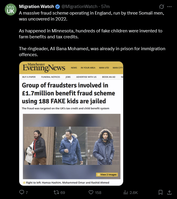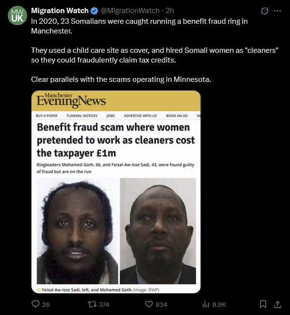 https://xcancel.com/maxtempers/status/2008498014500086016#m>Why would a Somali-run children's day care centre in Leicester employ four people when they have zero children enrolled?>Behind on the accounts too. Oddly can't seem to ring them up to enrol a child either. None of the contact details work.>They failed an Ofsted inspection despite having no children on the premises. >I learn that nursery workers are on the shortage occupation list for skilled worker visas.um, bulbheadbros, our response?