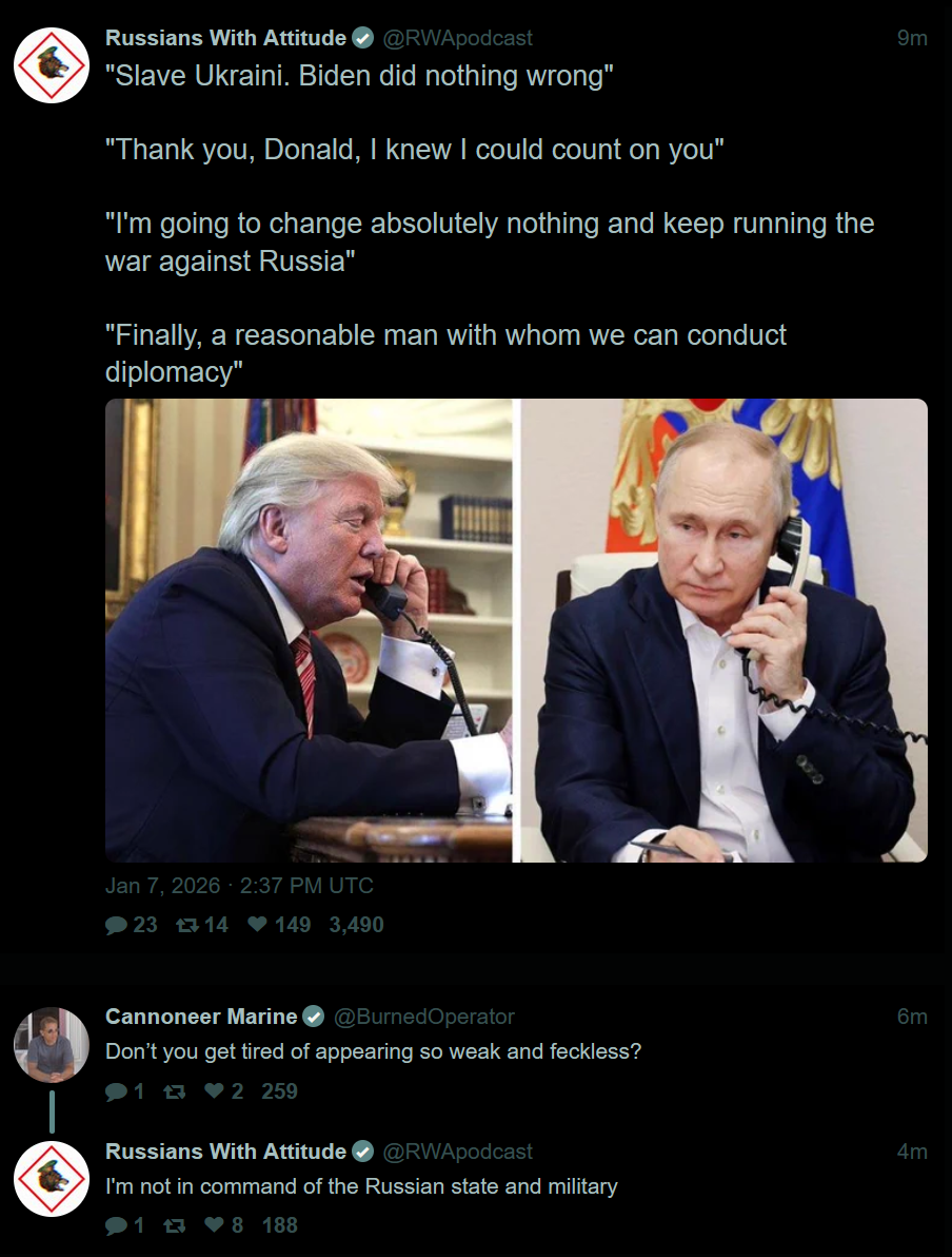 >the ork shill force having a big melty>Russian refinieries bombed>US seizes Russian tanker>Russia humiliated by the 3 hour maduro mission2027 starting off strong.