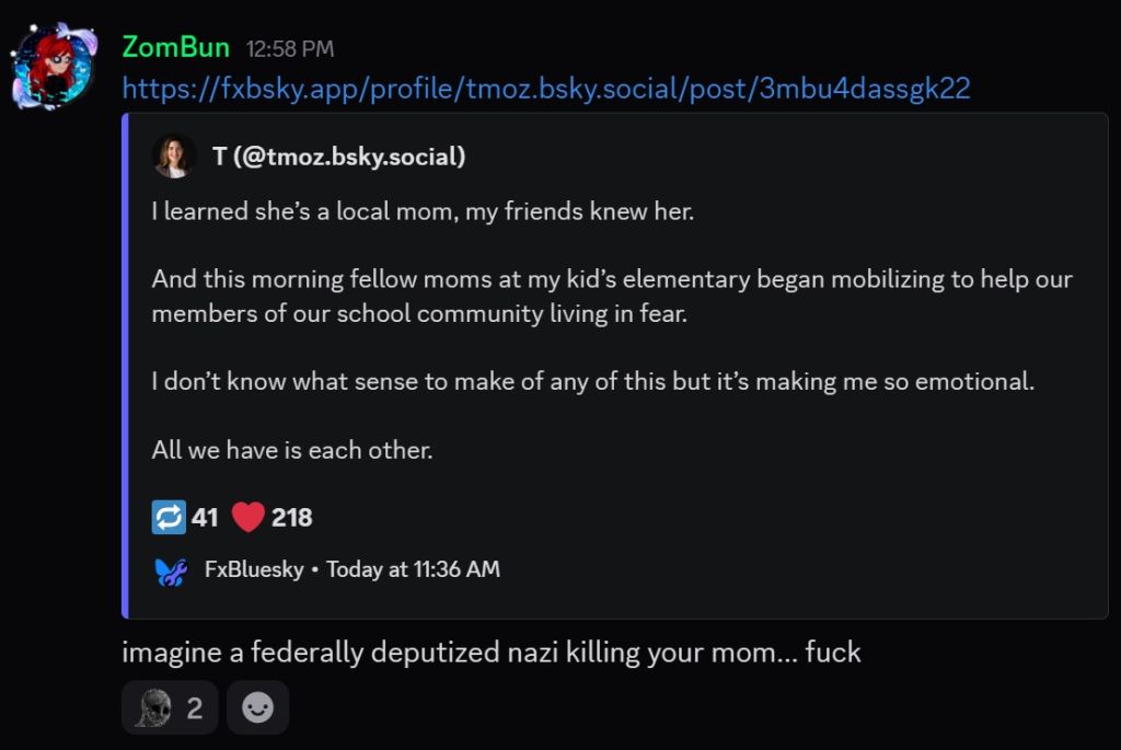 It's somewhat depressing (but unsurprising) how gleeful you faggots are about jackbooted thugs murdering unarmed, innocent American citizens in broad daylight. Spare everyone the outrage the next time some pampered white kid commits a school shooting and the next Democrat in office advocates banning assault rifles, you faggots can stop pretending your care about using the Second Amendment to defend against actual gubmint tyranny.The same people crying for civil war over having to wear a mask to enter the local McDonalds at the height of COVID (which was under Trump btw) are perfectly okay with a bunch of untrained, crayon-eating jackbooted losers with guns and an unwarranted sense of self-importance storming cities, separating families, disappearing children, beating pregnant women into miscarriages and summarily executing multiple people while the White House lies about it to everyone's faces to the tune of zoomer sigma phonk edits and other ebic maymays.Keep sucking the Trump Administration's boots! I'm sure it'll never come back to bite you.