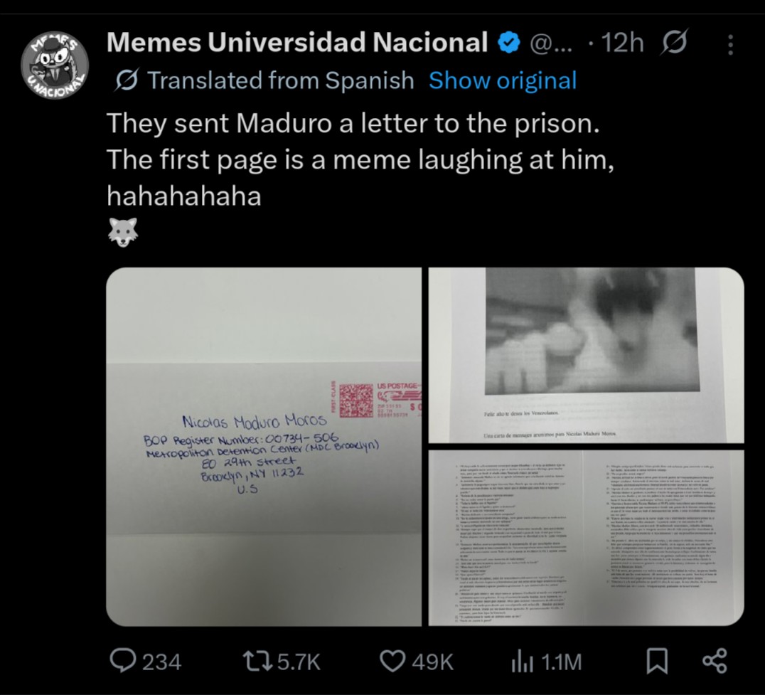 >>525507992So was the picture of the letter posted by the person who sent it, or did the jail actually open it and share?Can we even know if Maduro ever receives it?