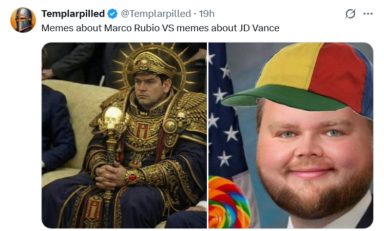 >Narco rubio conducting a raid in Venezuela, planning strikes against cartels, holds talks with Ukraine, seizing russian oil tankers, etc etc etc>Meanwhile the currynigger lover VP just acts like a manchild on the internet