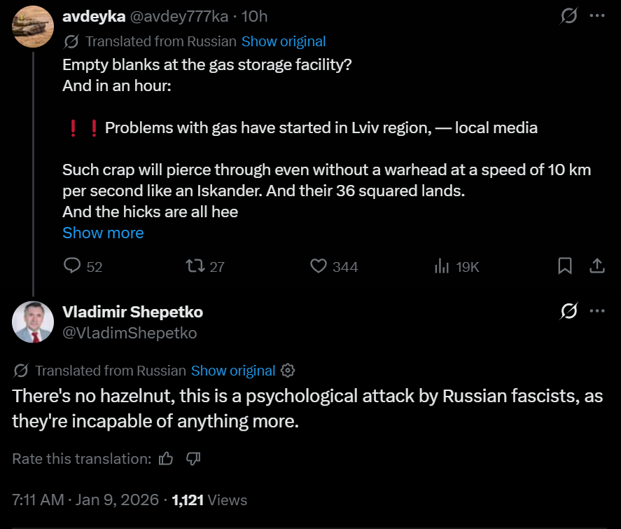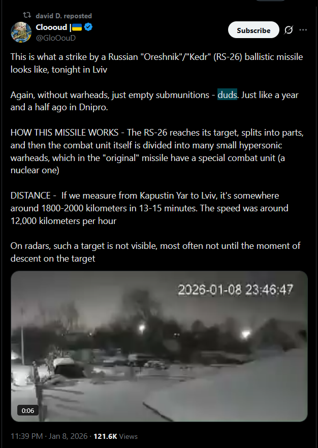 >Military Chronicle on Oreshnik:>At present, there are effectively no targets on the territory of the former Ukrainian SSR where using this weapon would be a rational choice. The vast majority of Russia’s tasks are already handled by existing assets: Iskander-M operational-tactical systems, Kh-101 cruise missiles, aviation, and unmanned systems. These tools cover nearly the entire target set required for operational and strategic planning in terms of range, precision, and yield.>Oreshnik, as is obvious, was never designed primarily for missions limited to the SMO. Its use serves a different audience and sends a signal at a different level. The timing of its second employment coincided with renewed discussions in several European countries about deploying their own contingents to Ukraine—in formats ranging from “observer” missions to limited military involvement.>In this context, Oreshnik functions as a classic, even textbook, element of nuclear deterrence. Its purpose is not the destruction of specific objects, but the demonstration of time and technical parameters of impact that render the very idea of deploying foreign forces or weapons—whether in Ukraine or elsewhere in Europe—meaningless. Here, excessiveness is deliberate, allowing the required signals to be delivered clearly and within a short timeframe.