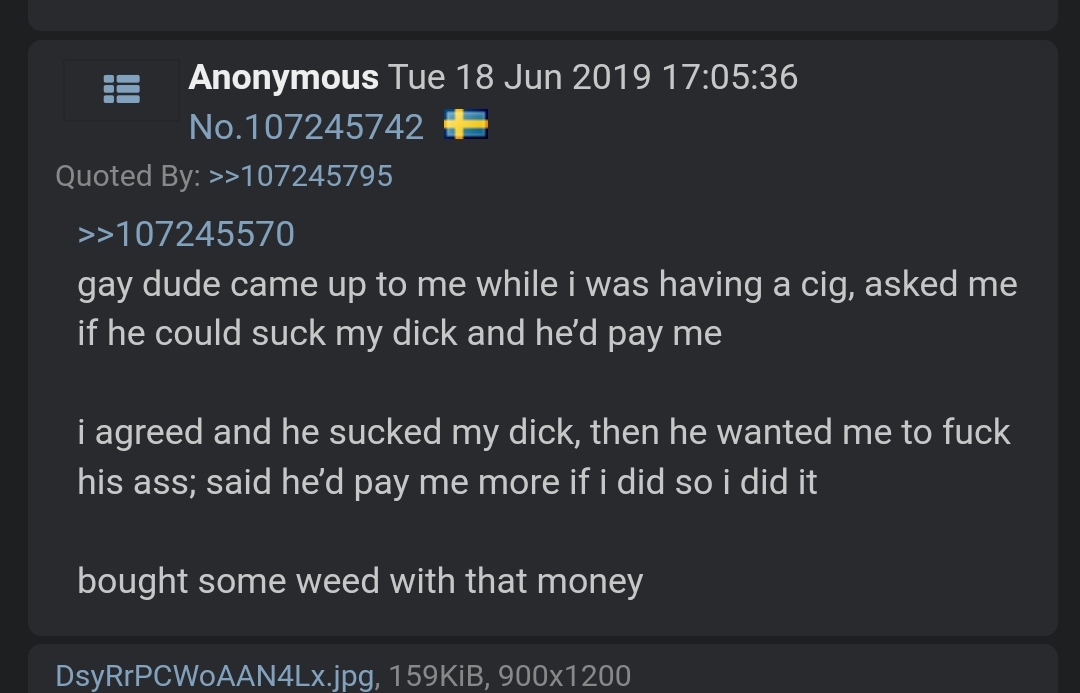 >>525516594>>525516659There's a Russian saying that I haven't seen quoted often: "There's no better vagina than comrade's asshole. Though it smells worse, it is also tighter" (it rhymes in Russian)