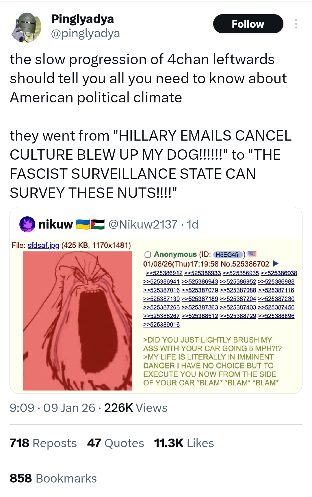 >>525541782So you are, with a lolbertarian flag, defending a surveillance state? /pol/ has always been populist. 4chan went from populist left to populist right over the years as the libs absolutely immolated the respectable side of leftwing politics (a healthy nation/healthcare, pro working class, etc.). Now that the leading figure of the "populist" right (Trump) has proven to be a neocon rugpull the whole time, people are adapting. You sound like (((Ben Shapiro))) and co. calling Tucker and Candace "secretly left wing" because they don't want their money going to kikes. People are waking up, left and right. Cry about it shill.