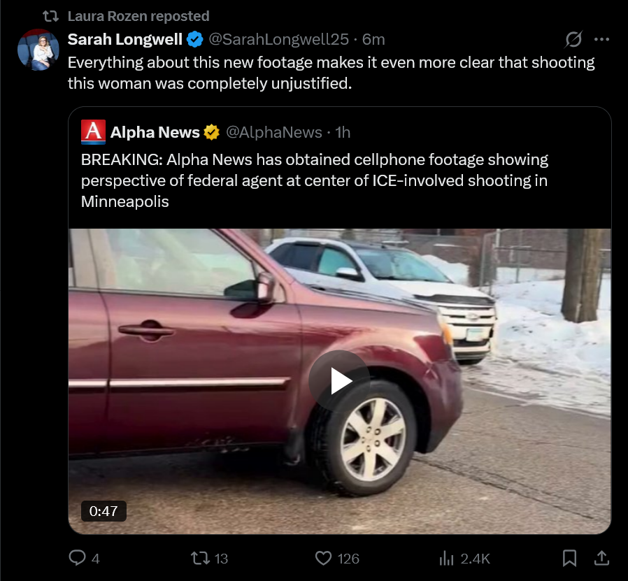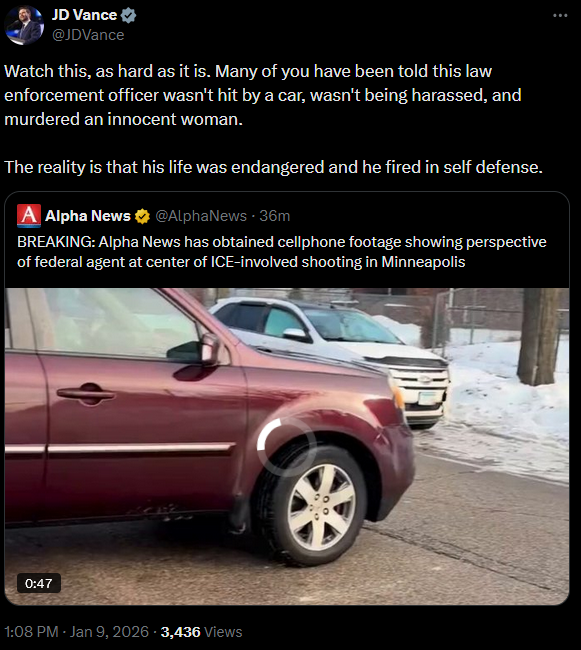here's the video in the OP, makes it pretty clear that the ICE agent was in the righthttps://x.com/AlphaNews/status/2009679932289626385