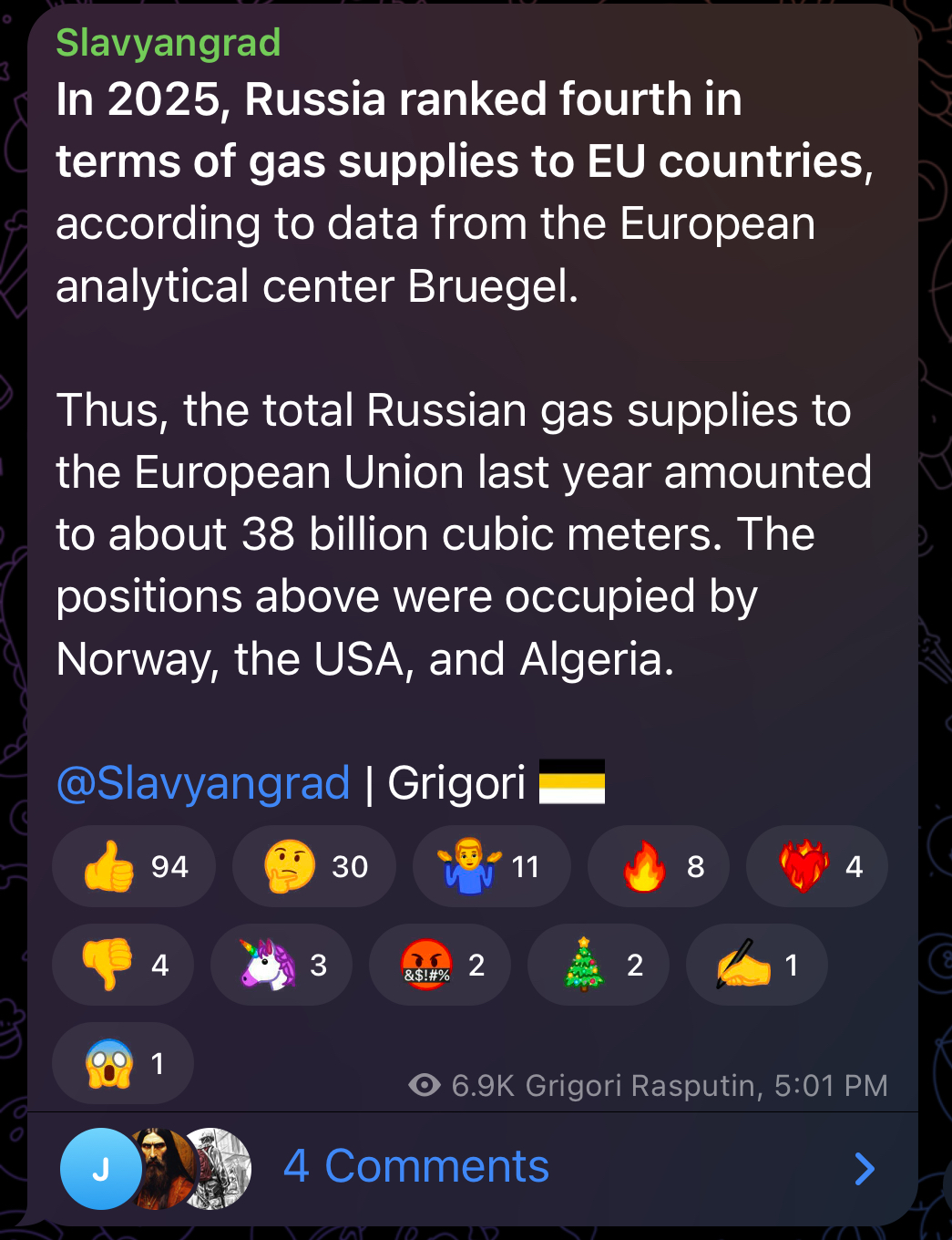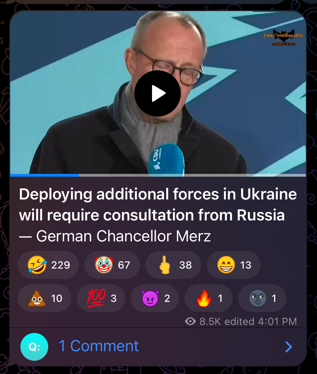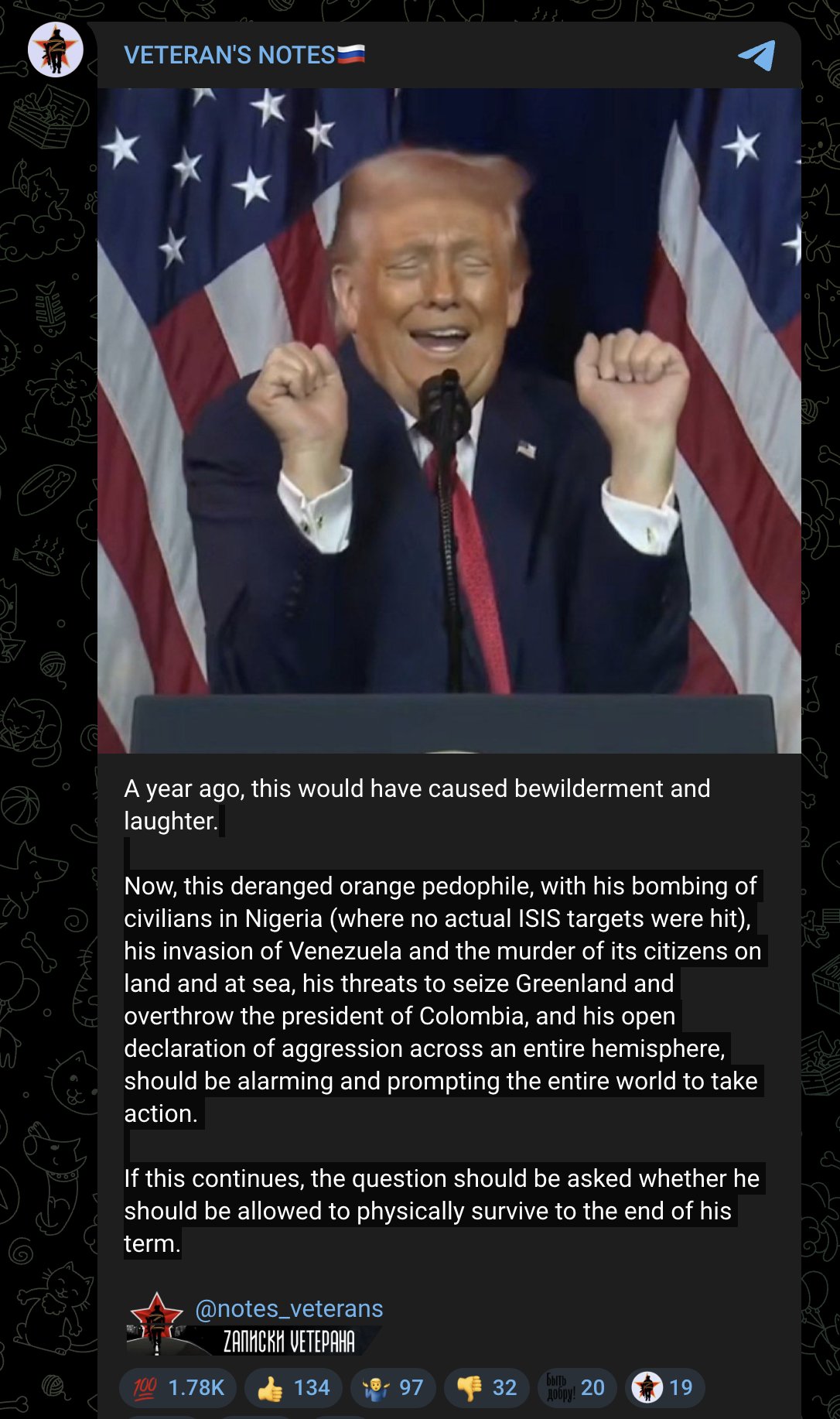 Previous: >>525527741Day 1,416 – Daily assessment: understandingwar.org/analysis/russia-ukraine/#research▶Latest>Adam kadyrov, son of chechen leader ramzan kadyrov, said he would find and bring Zelenskyy to Grozny if ordered by putin or by his father>Smoooking accident at Orel heating plant>500k consumers without power in Belgorod after strikes on critical infrastructure>pidor chimpout in response to the "attack" on monke's residence (didn't happen, should've happened), an oreshnik irbm was also used, 500k consumers without power in Kyiv>russian troops strap Starlink terminals to horses>Smoooking accident on the Palau-flagged oil tanker Elbus off the coast of Turkey>U.S. seizes russian tanker as they cuck out and do nothing but watch>Hegseth openly mocked russia’s air defense systems.>UK and France to send troops to Ukraine post-war>Czech-led ammunition initiative for Ukraine will continue - Babis>russia Cannot Maintain Its Ports in the Arctic - SZRU>Ukrainian Defense Forces drone operators have for the first time achieved a “replacements-losses” balance using UAVs only>Smoooking accident at the military arsenal in Neya city of Kostroma region>Zelenskyy has proposed appointing Mykhailo Fedorov as the country's new defense minister>pidors panicking in response to US 3 hour SMO>pidors fake a video about drone attack on monke's palace>Budanov is the new Head of President's Office, New HUR glowie is Oleh Ivashchenko>Rumours about Kadyrov being dead>White Rex lives, it was all a hoax to steal bounty money▶Telegramrentry.org/telosint2023t.me/ukr_pics▶Intelt.me/DeepStateENodin.tradoc.army.mil/WEG (equipment explorer)ukr.warspotting.net (visually confirmed losses)▶Mapsdeepstatemap.live/enliveuamap.com/en▶DISPOSABLE SOLDIER (diary of a RU mobik)TOURS 1-4: files.catbox.moe/mpcw7p.zip▶12 min of TZD in one ditch (Pokrovsk area) - 28 killedfiles.catbox.moe/sxbxfb.mp4