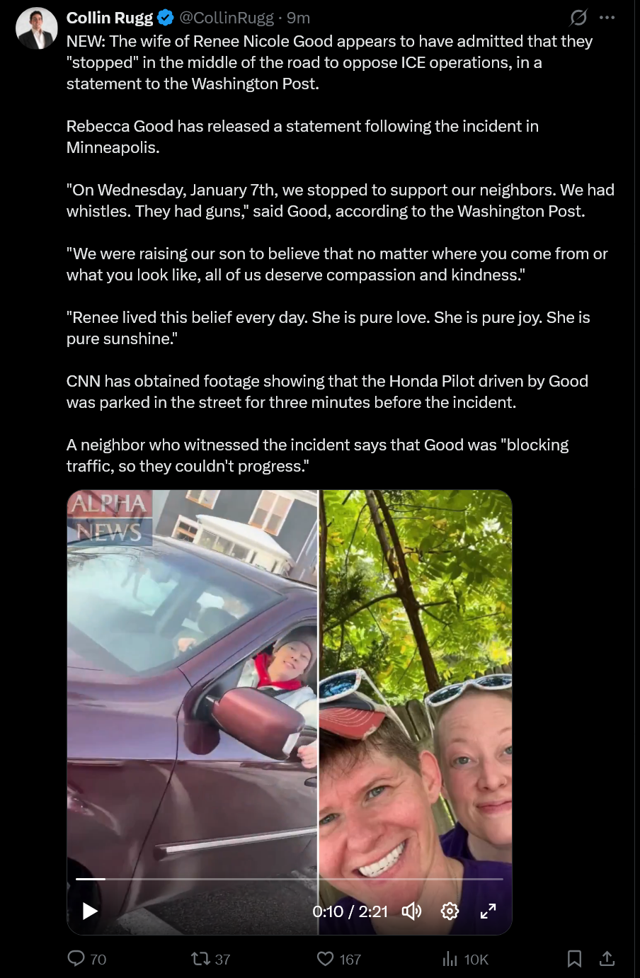 >>525549578>after someone hits you with a car.first, he pulled the gun before she moved forwardsecond, we have no evidence that she hit himif anything the best theory is that his left hand/arm that was holding his phone hit the hood of her car as she passed and he fired