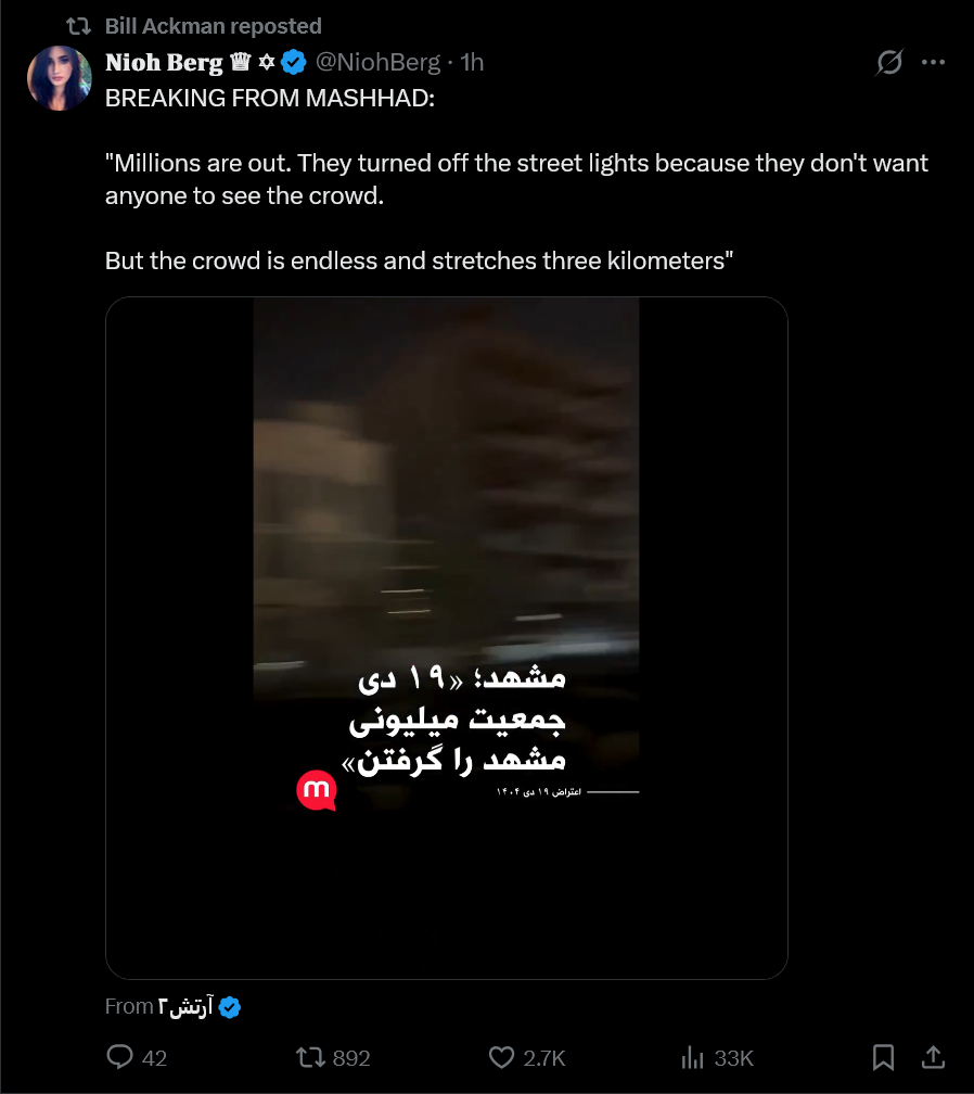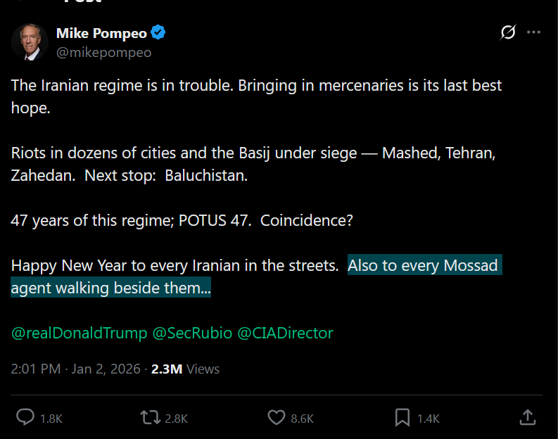 >>525553388They're not. It's yet another color revolution, Mike Pompeo literally admitted it. Why do you think Trump would ever give a fuck if Iran shot it's protestors or not, shit ICE just shot a protesting bitch in the face and no one gives a fuck lmao. https://x.com/mikepompeo/status/2007180411638620659