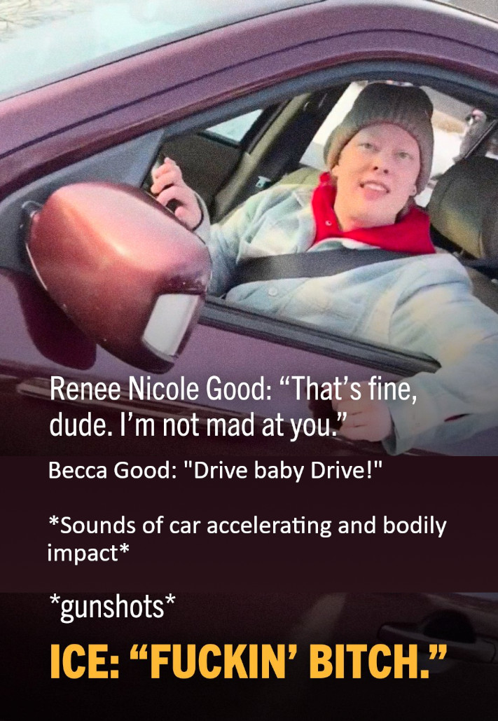 >>525563653>she just tried to run him overThat’s not what happened. The videos clearly show she wasn’t aiming her vehicle at anyone, She was justifiably frightened and just wanted to leave. Being arrested by ICE is not like being arrested by ordinary law enforcement. So she was properly terrified. No habeas corpus, no appearing before a magistrate within 1 business day and posting bail. Just vanishing into the “night and fog”; maybe winding up in CECOT. So she’s effectively dead either way