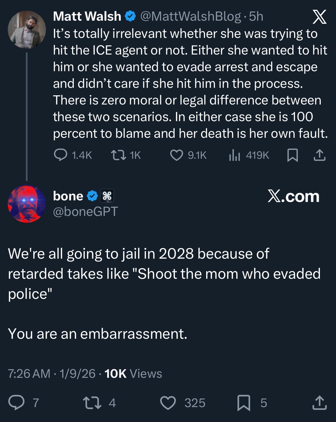 >>525562305The woman is like 1% in the wrong, ice butcherer is 99%. No point muddying the waters, its a clear abuse of power. Feds are held to higher standarts than civilians, you just dont shoot at a citizen white woman driving away even if shes a dyke and triggers pol snowflakes very much.