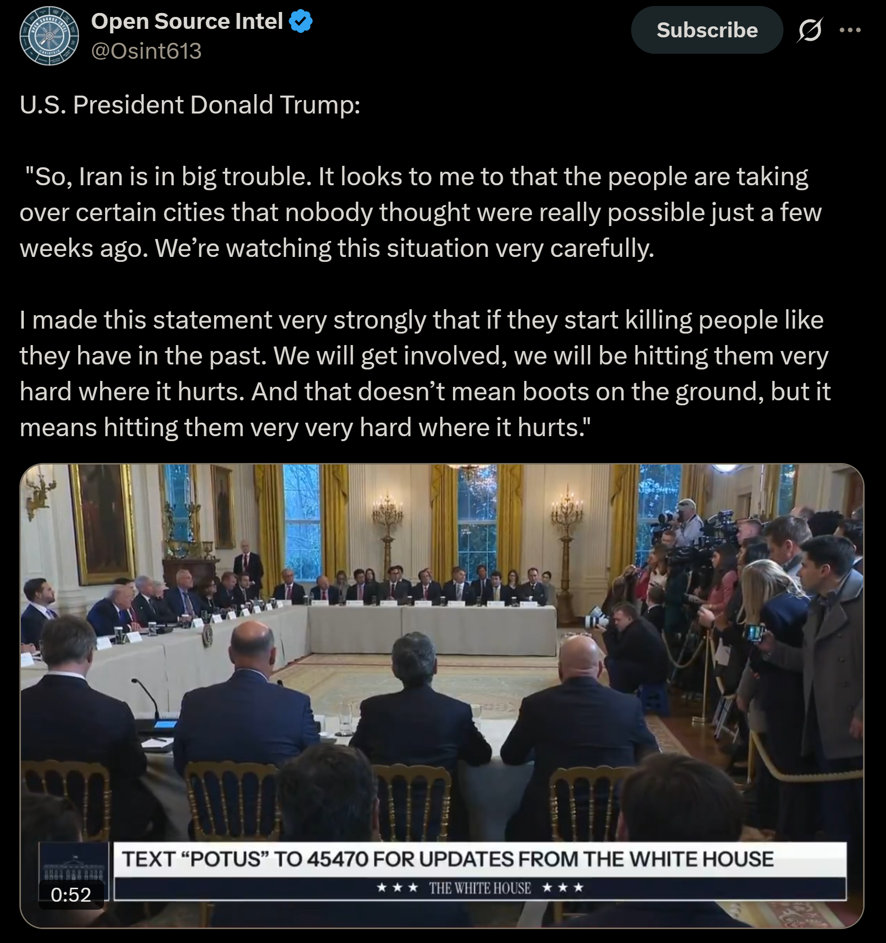>So, Iran is in big trouble. It looks to me to that the people are taking over certain cities that nobody thought were really possible just a few weeks ago. We’re watching this situation very carefully. I made this statement very strongly that if they start killing people like they have in the past. We will get involved, we will be hitting them very hard where it hurts. And that doesn’t mean boots on the ground, but it means hitting them very very hard where it hurtshttps://x.com/Osint613/status/2009731867550068988