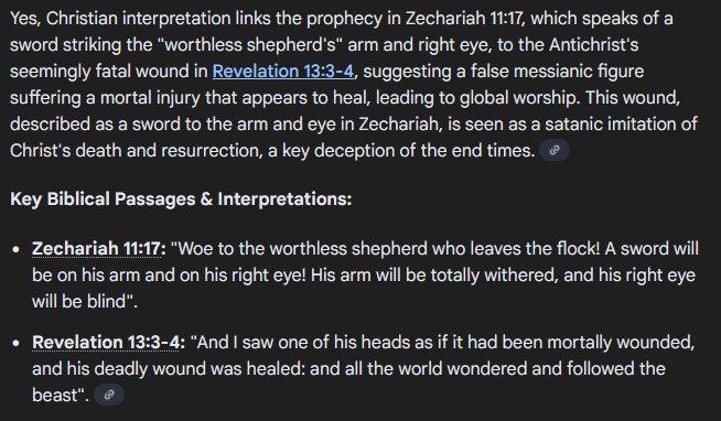 >>525580031i dont know greekso i post the english translations but the greek is more authoritative to interpretation than the english is it doesnt say the antichrist is "stabbed" or "beheaded"it doesnt even mention a head woundthe christian idea of a head wound comes from zechariah zechariah 11:17>“Woe to the worthless shepherd, who deserts the flock!>May the sword strike his arm and his right eye!>May his arm be completely withered, his right eye totally blinded!”the eye wound from zechariah is where christians got the idea that his head will be wounded