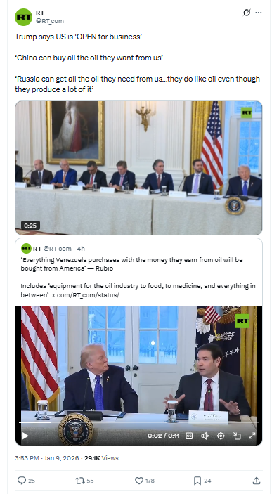 >‘We’re going to be there until we straighten out the country’ — Trump on Venezuela. Trump said the US will be “running the oil” and meeting with “the top 14” oil companies at the White House, claiming they could invest at least $100B to rebuild Venezuela’s oil infrastructure.