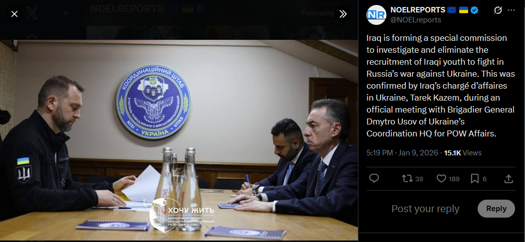 Iraq is forming a special commission to investigate and eliminate the recruitment of Iraqi youth to fight in Russia’s war against Ukraine. This was confirmed by Iraq’s chargé d’affaires in Ukraine, Tarek Kazem, during an official meeting with Brigadier General Dmytro Usov of Ukraine’s Coordination HQ for POW Affairs.