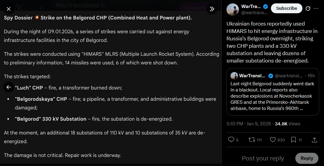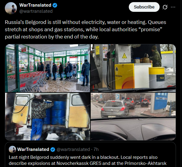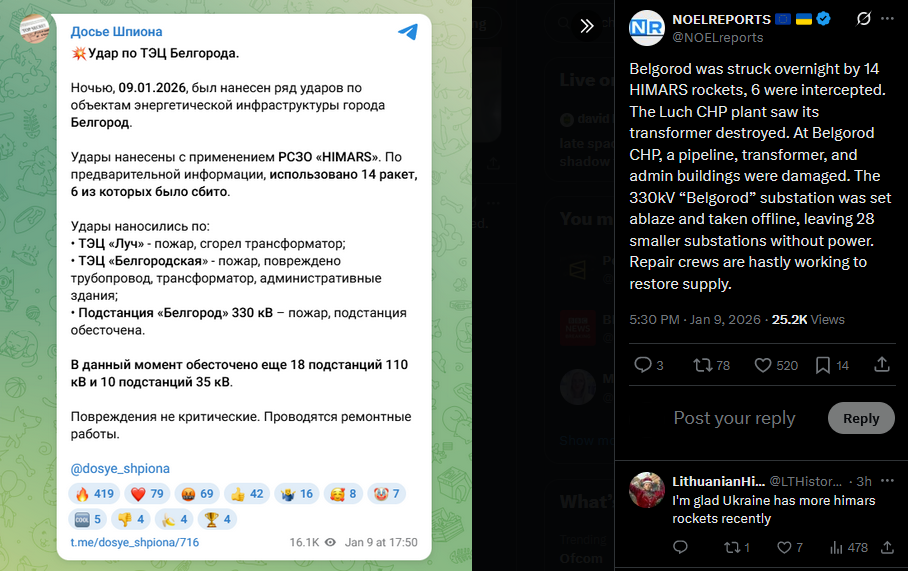 Belgorod was struck overnight by 14 HIMARS rockets, 6 were intercepted. The Luch CHP plant saw its transformer destroyed. At Belgorod CHP, a pipeline, transformer, and admin buildings were damaged. The 330kV “Belgorod” substation was set ablaze and taken offline, leaving 28 smaller substations without power. Repair crews are hastly working to restore supply.
