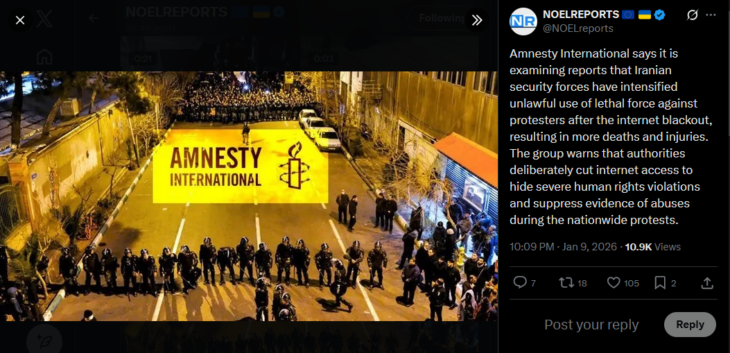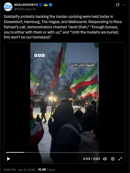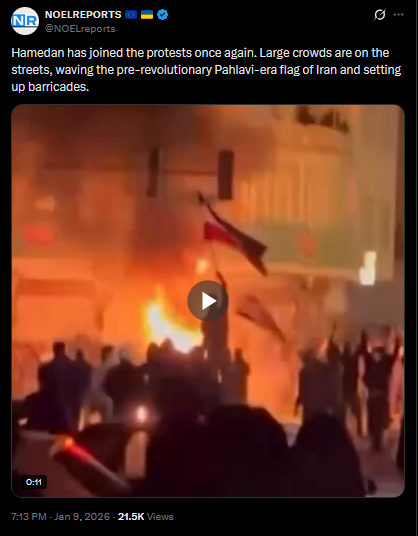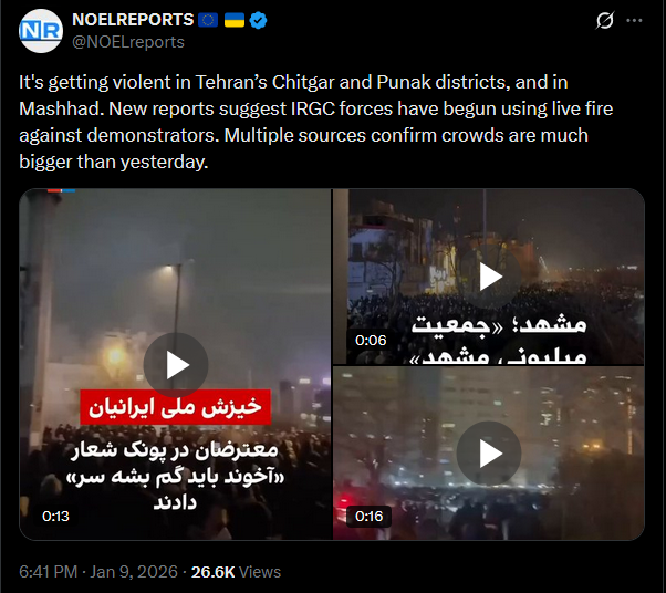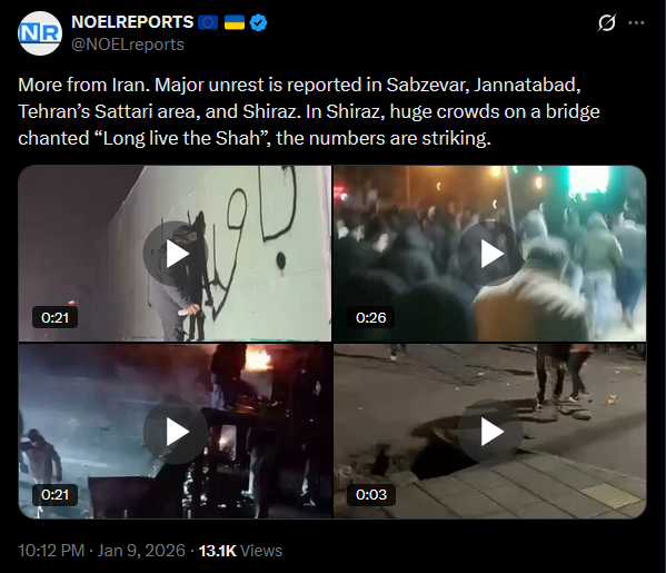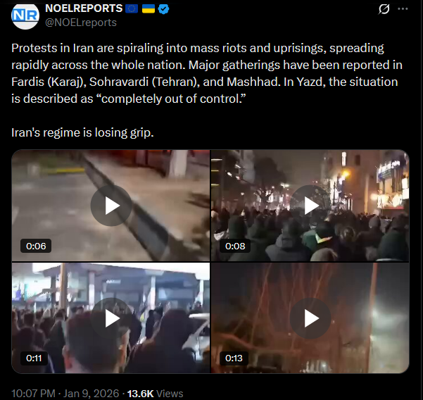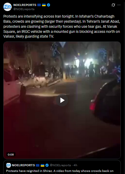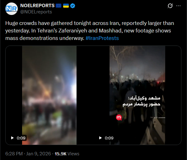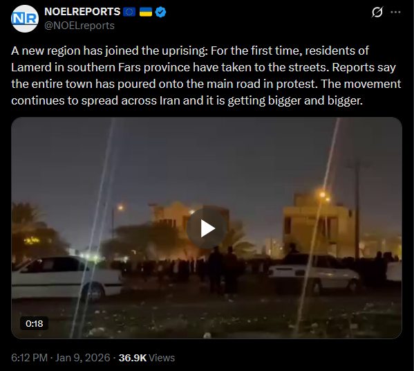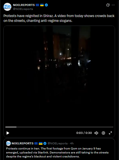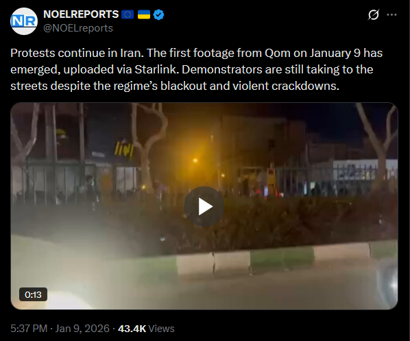 Protests continue in Iran. The first footage from Qom on January 9 has emerged, uploaded via Starlink. Demonstrators are still taking to the streets despite the regime’s blackout and violent crackdowns.