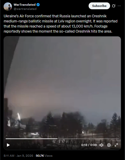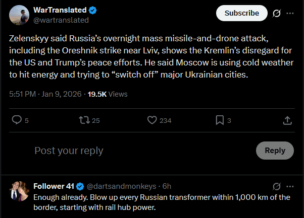 >pidor chimpout in response to the "attack" on monke's residence (didn't happen, should've happened), an oreshnik irbm was also used, 500k consumers without power in Kyiv