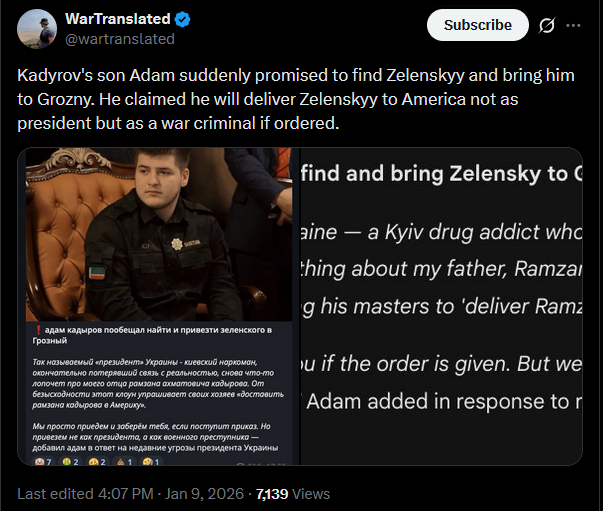 >Adam kadyrov, son of chechen leader ramzan kadyrov, said he would find and bring Zelenskyy to Grozny if ordered by putin or by his father