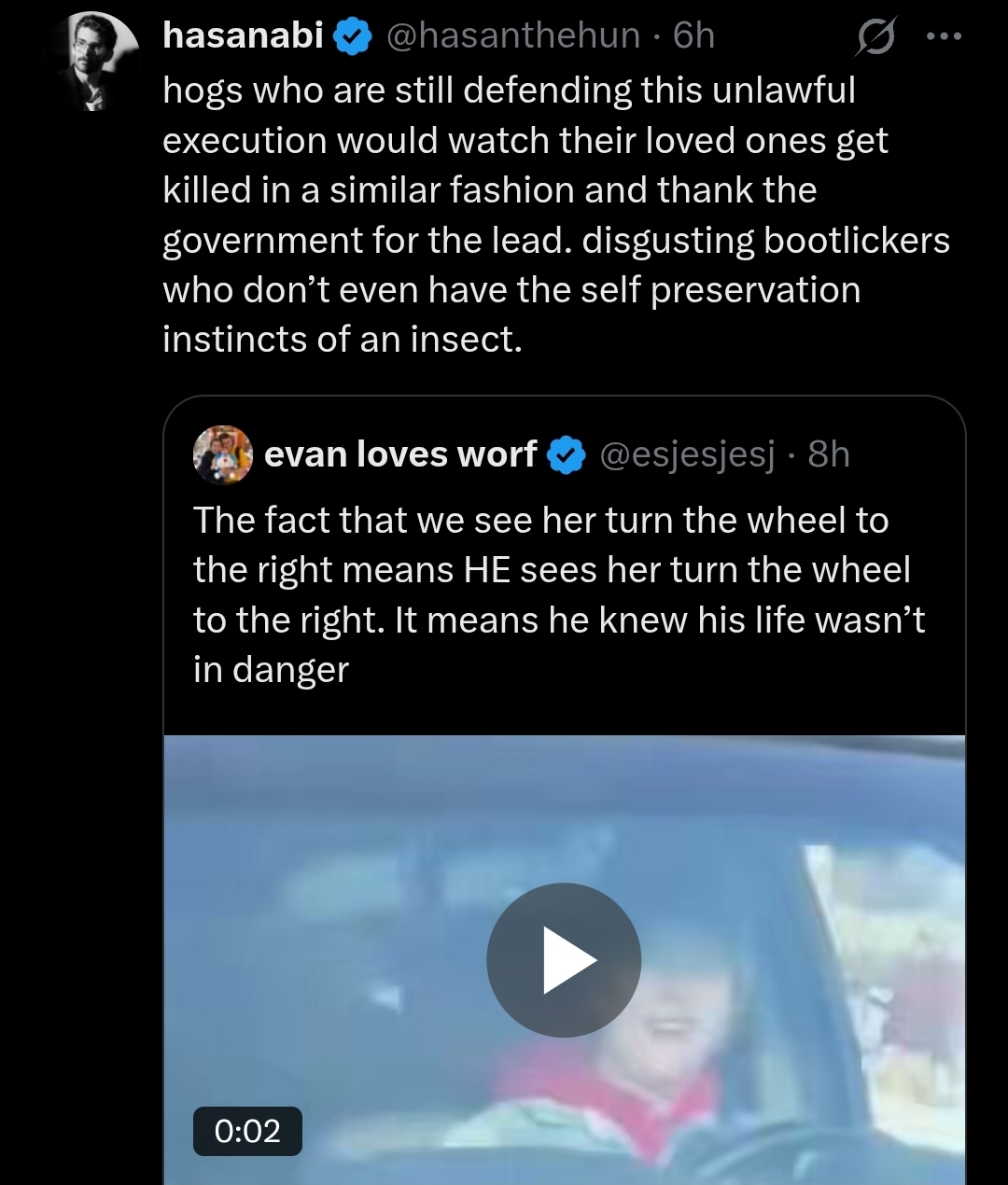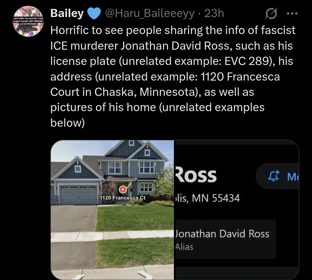 >>525598755it's actually NOT a similar situation because>there are no masked thugs rushing to the vehicle, instantly reaching inside, and scaring the shit out of the driver (properly trained police don't do this btw, they give you a lot more time to obey their lawful order to get out, and they avoid instant escalation unlike untrained ICE thugs)>Renee Good was turning her vehicle as much as possible to avoid the ICE agent>the ICE agent called Renee a "fucking bitch", indicating a possible misogynist motive for the shootingalso, Obama deported 3,000,000 illegals without any incidents like this ever occurring. maybe Trump would be a more effective leader if he didn't make half the country hate his guts lmao