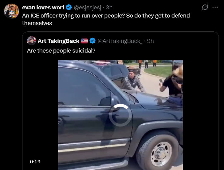 >>525612293>marvelI saw some woman literally trying to push an ICE truck as it is moving..like she was the Hulk. Something isn't right with them.The only other time I've seen that is an Indian gore vid of some dumb guy standing in front an out of control 18 wheeler with his hands out like he was gonna stop it. Bollywood brain.