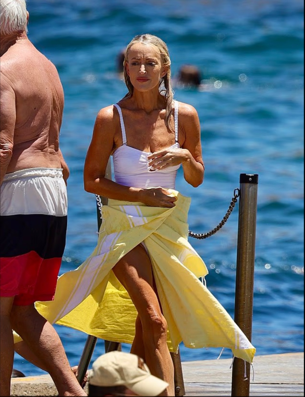 >She also came prepared with a colourful beach towel that she splayed out on the concrete promenade adjacent to the water.