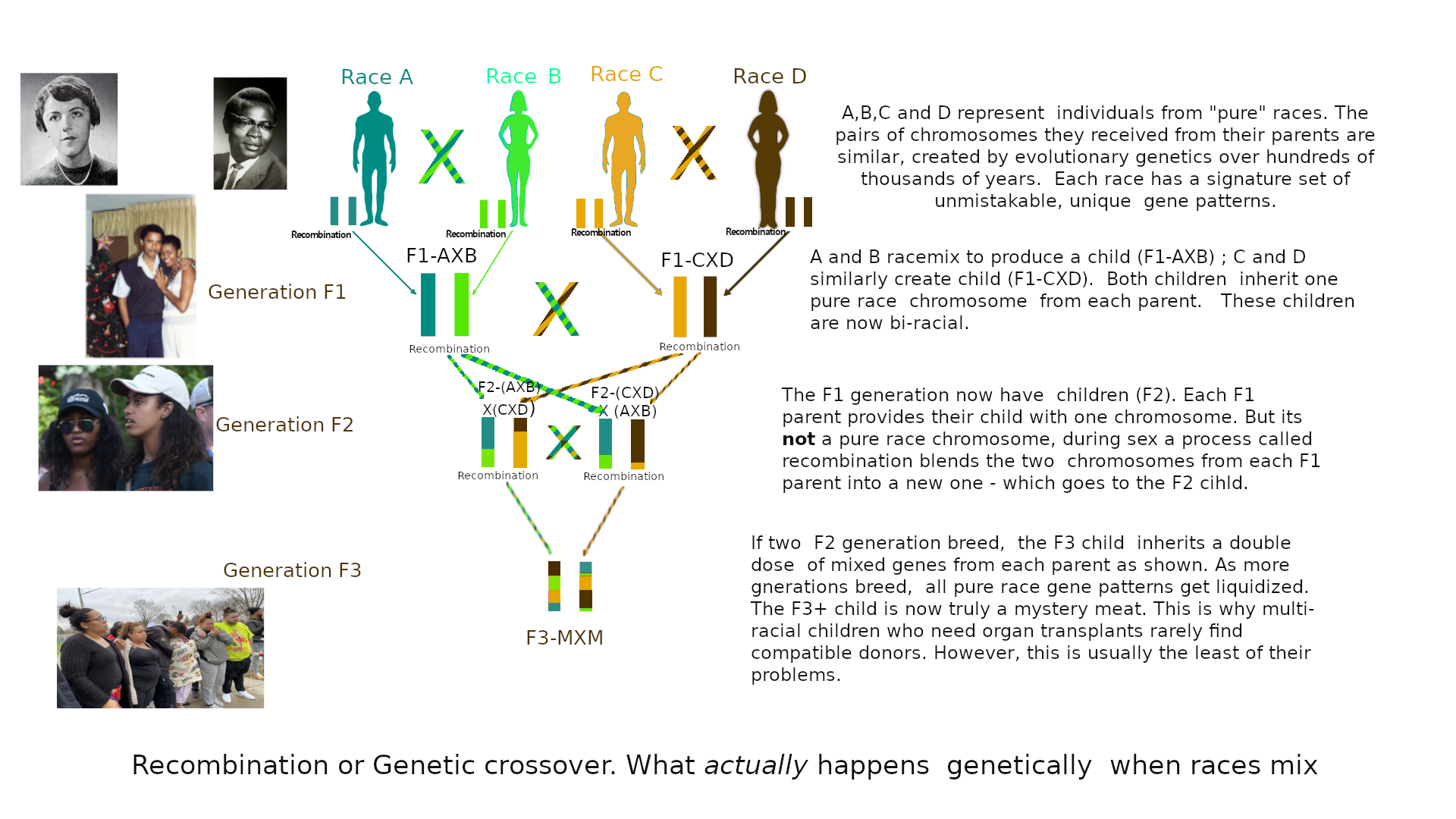 >>525639505>>525643537You only need to look at countries with mixed races to see there is something very wrong with them (on avergae).In order to explain why it is important to understand that complex human traits like height, skin color, genetic diseases, brain size and cognitive abilities etc are controlled by up to THOUSANDS of genes. If your parents are from two different but " pure" races, then the chromosomes you get from each them are very different. But they are each "pure" race genes. In this case, one parent is a “pure” race and other is a mulatto.Look at picrel; Generations F1 and F2 are both mulattoes. But there are fundamental differences, the F2 generation child gets a cut and spliced mix of pure race genes from its F1 parents, whereas the F1 generation get two pure race genes – one from each parent. See https://youtu.be/BlnUNmfGn7I?t=190 for precisely why this happens.The chromosomes that the F2 generation get from (F1- A X B) or (F1-C X D) could be cut and spliced by as much as 50% or it could be almost zero. There is usually always some. Now lets say the mixed race mother has a set of chromosomes similar to those shown for child {F2-(CXD)X(AXB)}. You can see that it is quite possible that she can pass on an “almost” pure race D (dark brown) chromosome to her child. Lets say D is is white and if her partner is white, then she could have a white looking child. But the child isnt European. And the odds are against this happening. The first 3 or 4 generations of race mixing is a high stakes poker game for European external traits. Particularly if one parent is always European. But the real genetic damage is done in the F2 generation. When all 23 chromosomes are cut and spliced in different racial segments. The only path to recovery is strict Eugenic selection with many generations. And if the only legacy you leave your children is to try and recover white, why the fuck race mix in the first place?