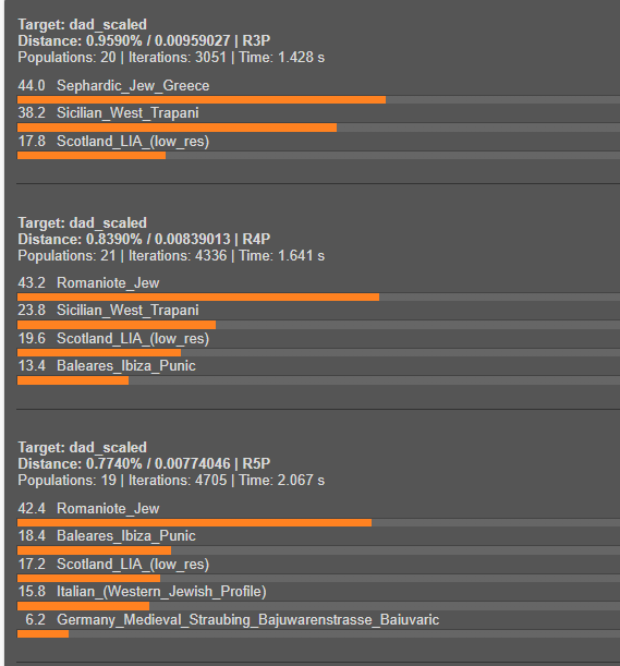 >>525654949My dad scores 25% on FTDNA and gets picrel with only Euro populations but he had surnames like Salamone, Dana, Maimone, Rubino ect. in his family.