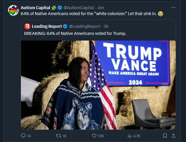 >>525646237Yes. Native American Indians and real stock Americans are basically the same thing. Just like Irish Whites and German Whites are basically hge same thing, in America.The only feather Indians that act like cringe dolts are the ones heavily influenced by the left who egg them on to act spastic about dumb shit, and ironically, the ones who were adopted and raised by White families