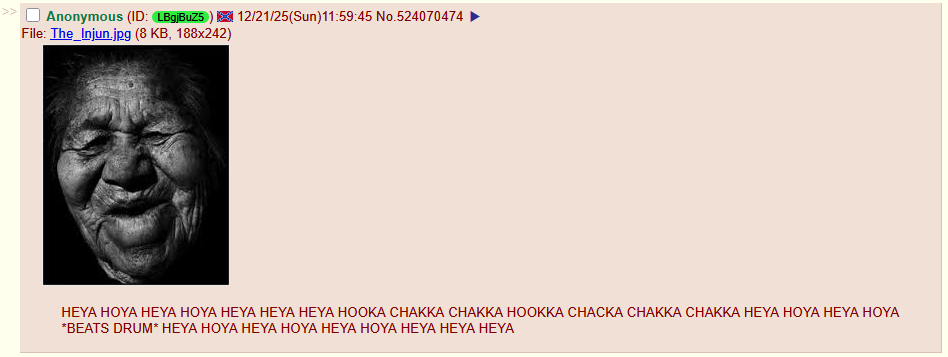 >>525673965>>525674191I am reminded of Bury my Heart at Wounded Knee:Chief Sitting Bull, the proposition that you were a peaceable people before the appearance of the white man is the most fanciful legend of all. You were killing each other for hundreds of moons before the first white stepped foot on this continent. You conquered those tribes, lusting for their game and their lands, just as we have now conquered you for no less noble a cause.The natives weren't noble savages, and my gut tells me that the noble savage up there is neither High IQ nor even Indian. They were a bunch of violent assholes who, when faced with their own medicine, squealed like a stuck pig that they were treated unfairly and then claimed every fucking blade of grass was sacred.