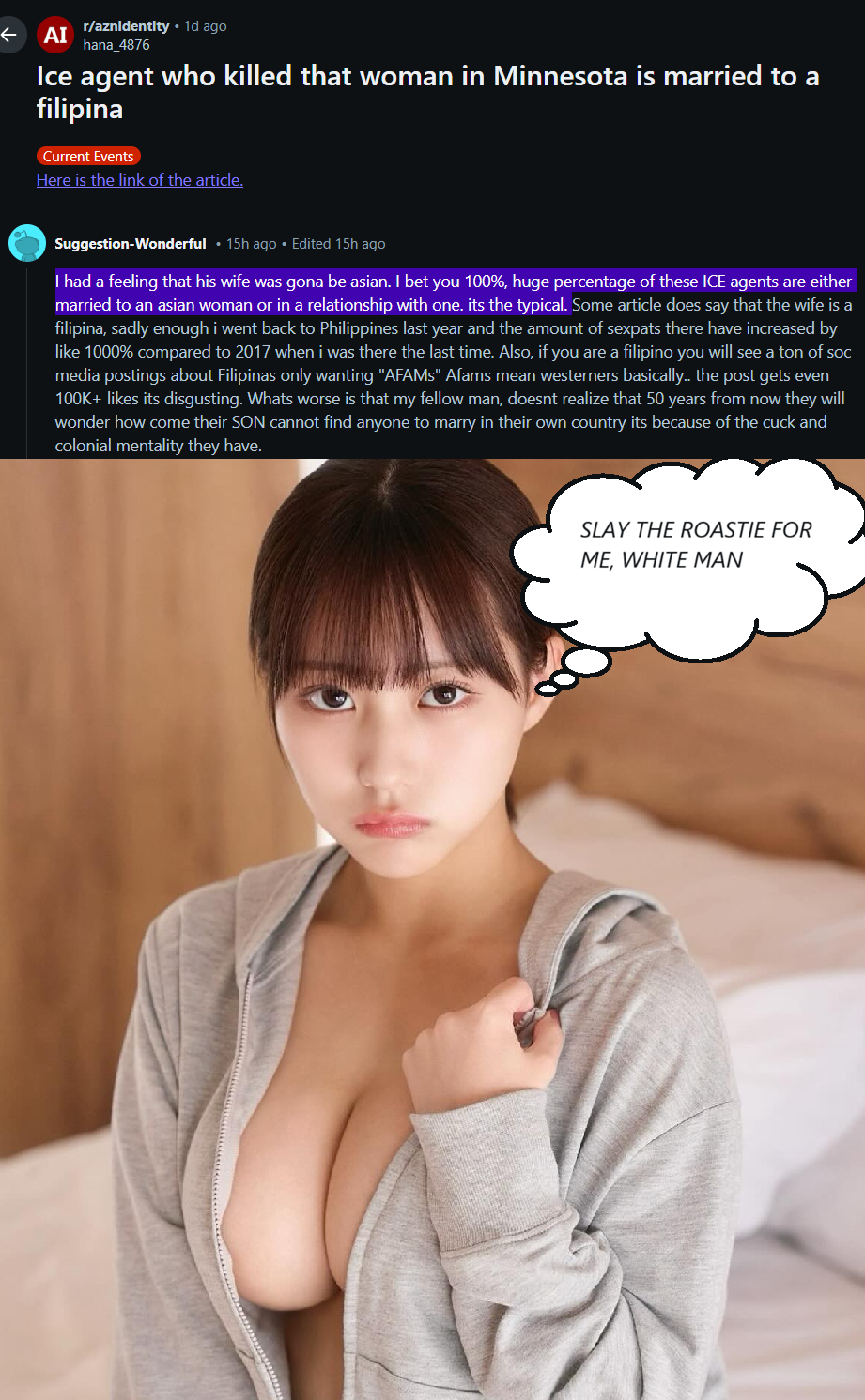 >>525651319>Removes liberal white roastie>Breeds his Asian wife in blissLETS GOOOOOOOORemember to also hunt down all these pathetic simps defending white women retardation. Canadian and American flags being the first priority.