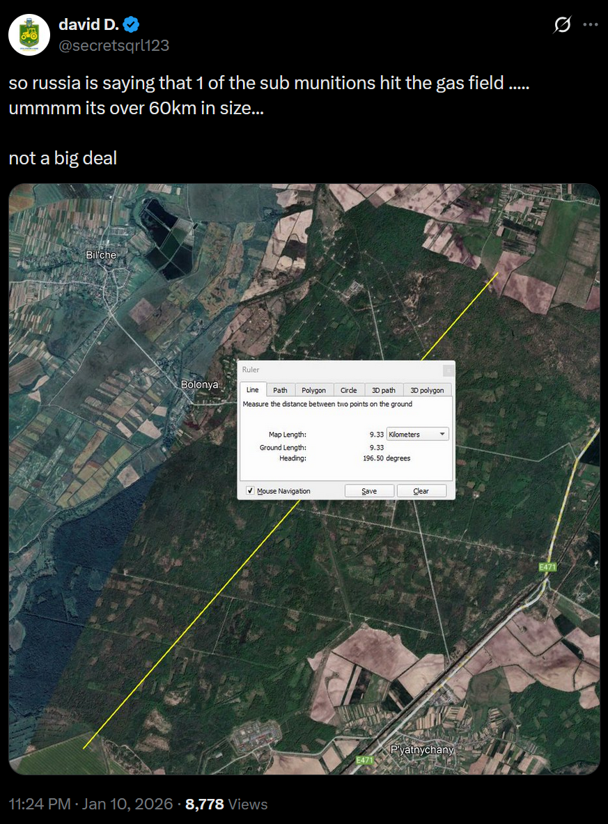 >so russia is saying that 1 of the sub munitions hit the gas field ..... ummmm its over 60km in size... >not a big dealbomb hyhyls... no big deal
