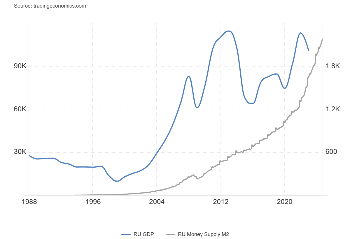 >>525692840>For what I understood, tt's more schizo than this, he's arguing that precious metal are actually a form of FIAT currency because the metal content in coin can be debased.I'm arguing that:1. Precious metal coins are FIAT currency if they can buy more precious metal, of the same purity, than they contain.2. Reducing the weight or the purity of the precious metal coins over time, from what they were originally, is a form of issuance of fiat currency. Especially if done by the legitimate, legal, lawful issuer of said coins but also if done without their knowledge or permission by unauthorised 3rd parties who counterfeit or clip the coins.>So his claim of "only FIAT currency can exist, all money is FIAT" would be true.What I actually said is that capitalism needs fiat currency to be legal tender and all capitalist countries have fiat currency as legal tender because only by allowing fiat currency to be legal tender can you geometrically expand the money supply for years, decades, maybe centuries on end.You're slow or have comprehension/cogitation problems and interpret that as me being dishonest.Do you deny the money supply growth graphs? Are those lies as well?Like this one, of Russia? Are the graphs lies too?If you try and claim the graphs are lies as well then, clearly, you're the dishonest one, not me.Go have a good cry about it and pray to Mammon for guidance.