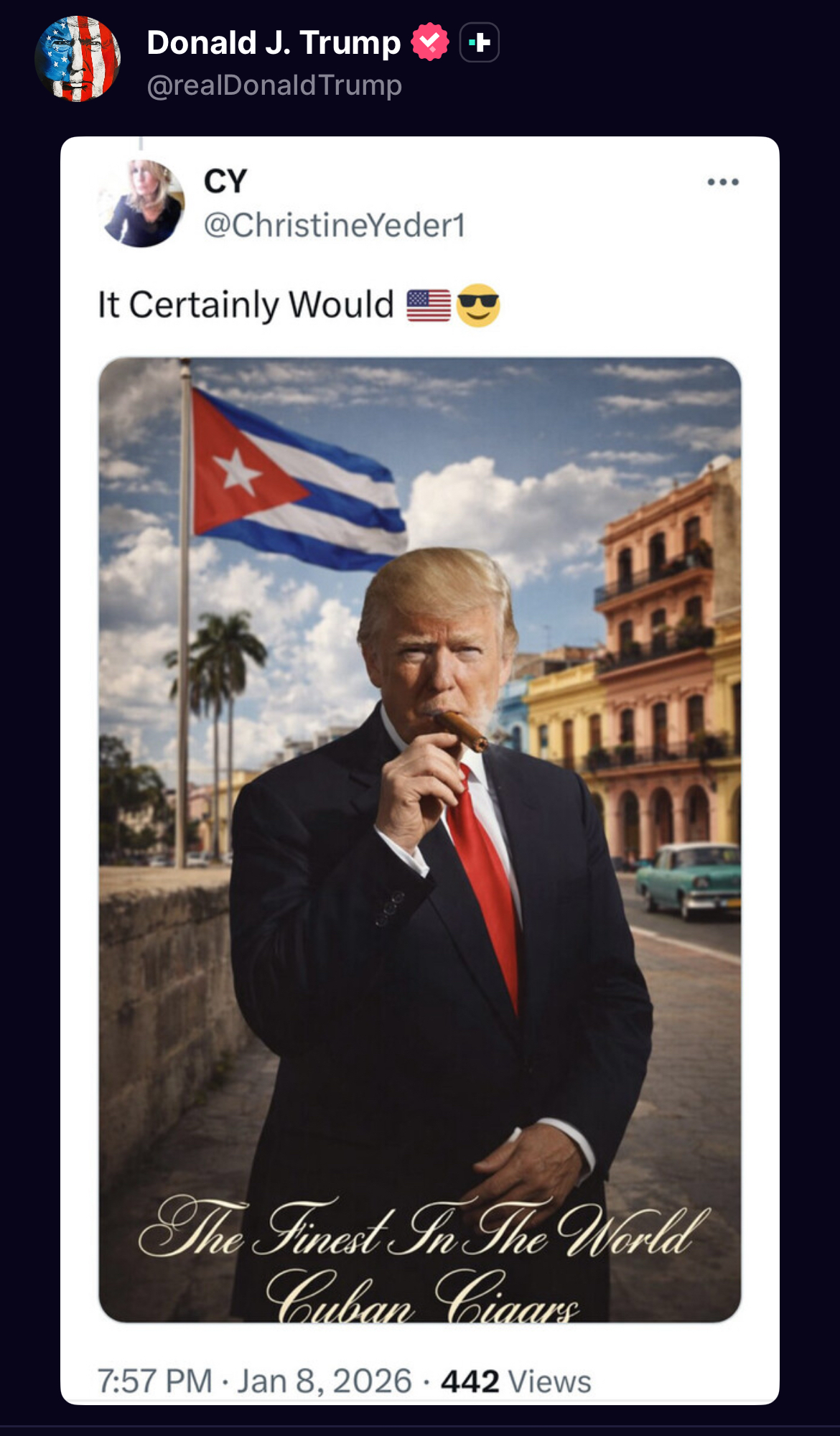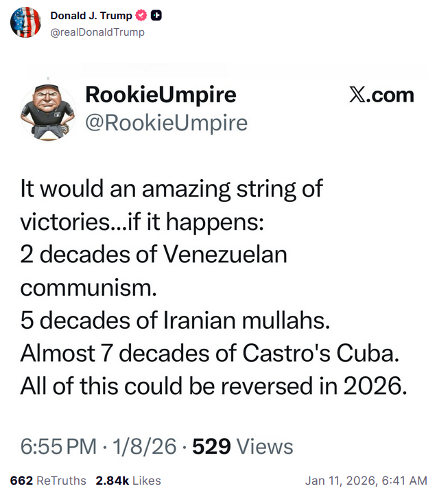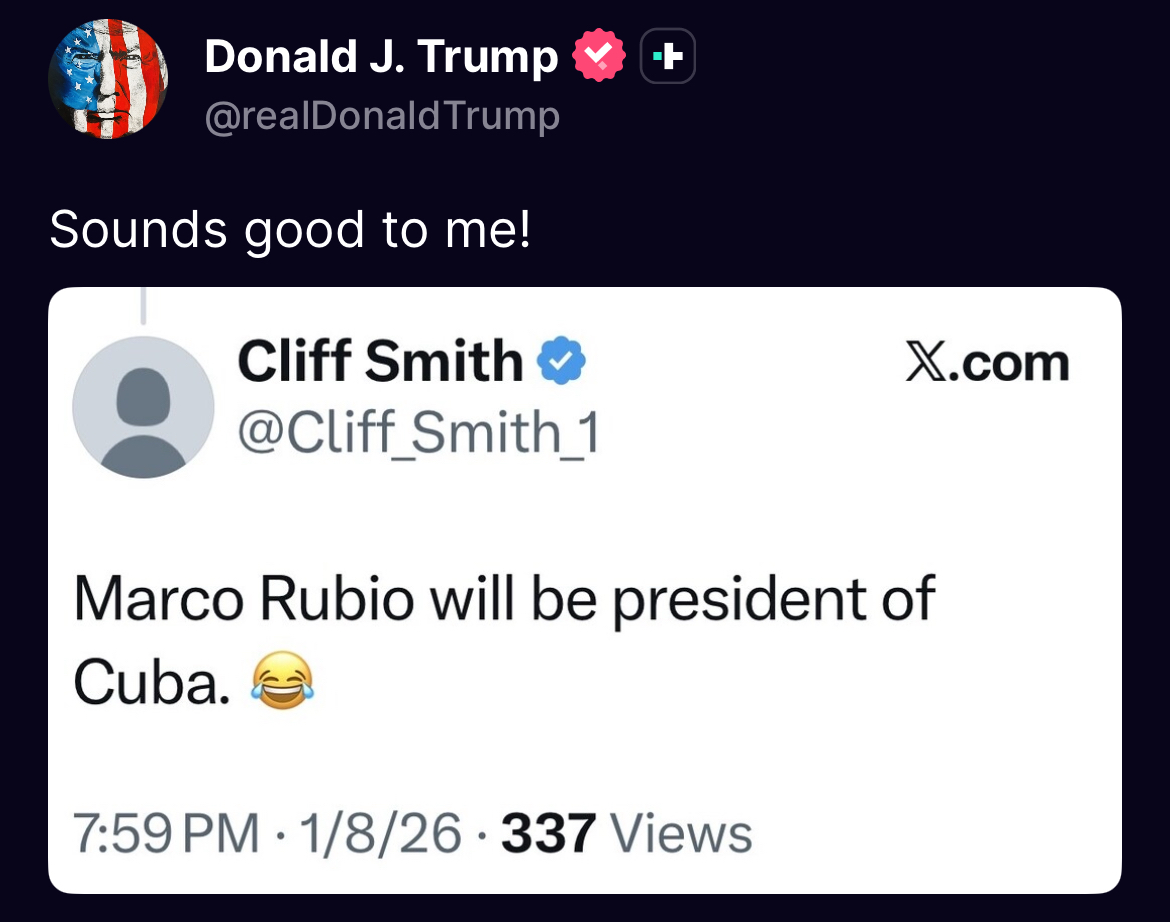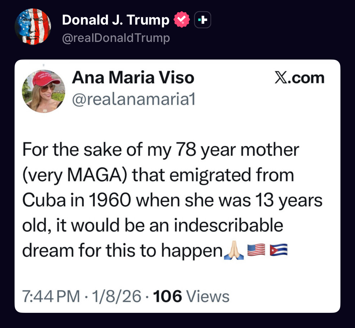 >TWEETCuba lived, for many years, on large amounts of OIL and MONEY from Venezuela. In return, Cuba provided “Security Services” for the last two Venezuelan dictators, BUT NOT ANYMORE! Most of those Cubans are DEAD from last weeks U.S.A. attack, and Venezuela doesn’t need protection anymore from the thugs and extortionists who held them hostage for so many years. Venezuela now has the United States of America, the most powerful military in the World (by far!), to protect them, and protect them we will. THERE WILL BE NO MORE OIL OR MONEY GOING TO CUBA - ZERO! I strongly suggest they make a deal, BEFORE IT IS TOO LATE. Thank you for your attention to this matter. President DJT