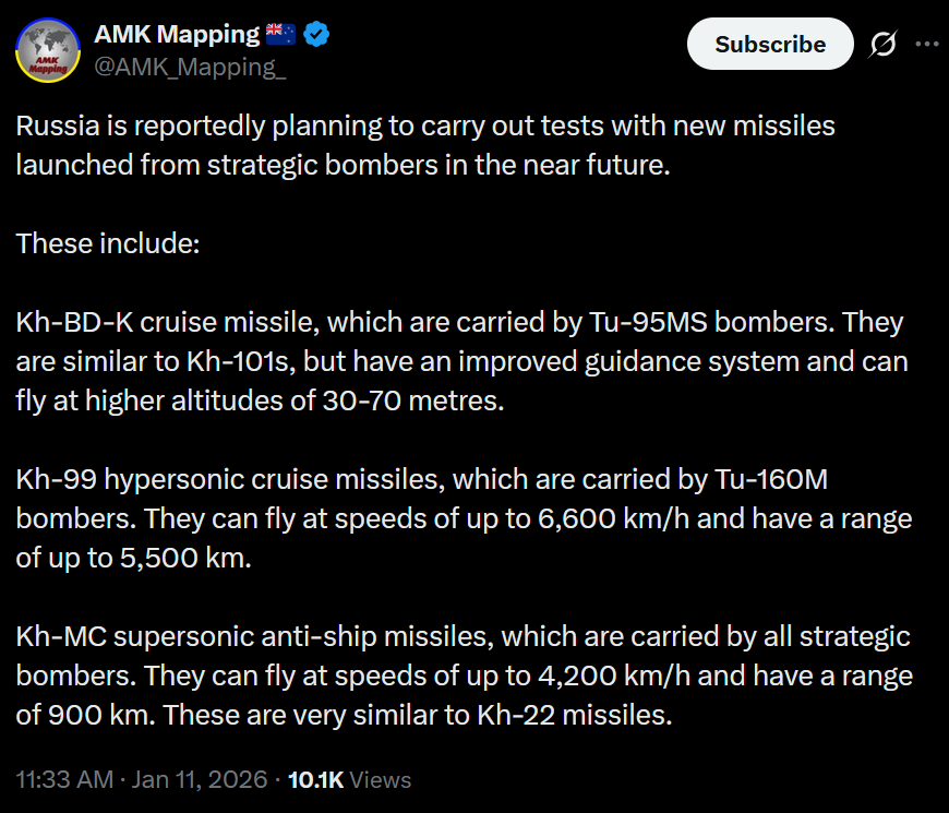 >Russia is reportedly planning to carry out tests with new missiles launched from strategic bombers in the near future. >These include:>Kh-BD-K cruise missile, which are carried by Tu-95MS bombers. They are similar to Kh-101s, but have an improved guidance system and can fly at higher altitudes of 30-70 metres. >Kh-99 hypersonic cruise missiles, which are carried by Tu-160M bombers. They can fly at speeds of up to 6,600 km/h and have a range of up to 5,500 km. >Kh-MC supersonic anti-ship missiles, which are carried by all strategic bombers. They can fly at speeds of up to 4,200 km/h and have a range of 900 km. These are very similar to Kh-22 missiles.damn illegal missile tests