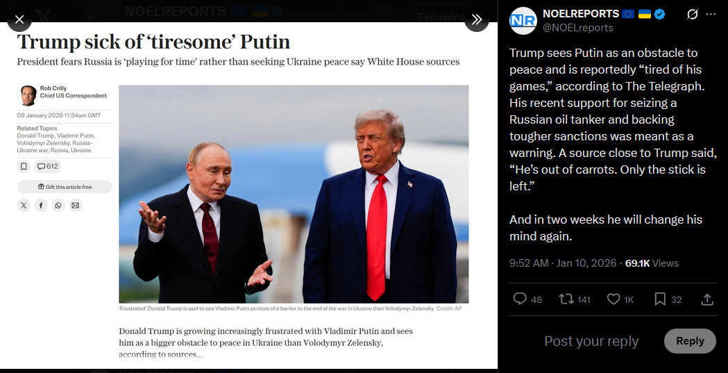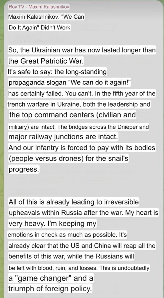 As of today, Russia’s full-scale war on Ukraine (1,418 days) has officially lasted longer than the entire period of WWII in which Moscow was no longer aligned with Nazi Germany, but was instead fighting against it (thanks to American Lend-Lease).In exchange for continuing to placate his obsession with Ukraine, the Russian dictator has progressively jettisoned Moscow’s entire global network of colonies, protectorates, and client states. Syria, Venezuela, Iran – and more to follow – the dominoes are lining up like 1989. As the US eagerly scoops up the pieces, Moscow’s nightmare has become an irrevocable and blinding reality.The Gargoyle Midget Czar bit off more than he could chew, and generations of Russians will pay the price.