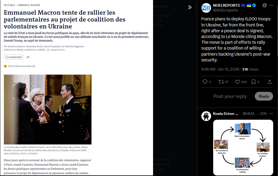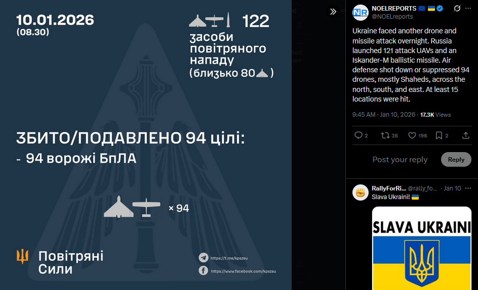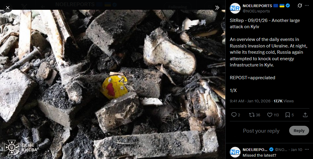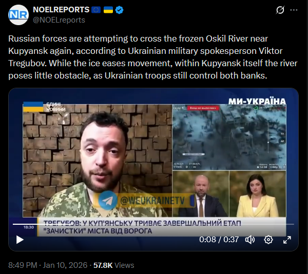 Russian forces are attempting to cross the frozen Oskil River near Kupyansk again, according to Ukrainian military spokesperson Viktor Tregubov. While the ice eases movement, within Kupyansk itself the river poses little obstacle, as Ukrainian troops still control both banks.https://x.com/NOELreports/status/2010091754553520485?s=20>19h