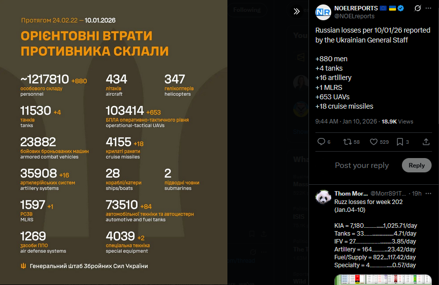 >>525726244SLAVA UKRAINI11.01.2026Tanks — 11541 (+11)Armored fighting vehicle — 23885 (+3)Artillery systems — 35952 (+44)MLRS — 1598 (+1)Anti-aircraft warfare — 1269Planes — 434Helicopters — 347UAV — 104068 (+654)Cruise missiles — 4155Ships (boats) — 28Submarines — 2Cars and cisterns — 73644 (+134)Special equipment — 4039Military personnel — aprx. 1218940 people (+1130)