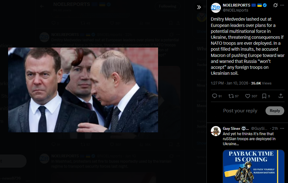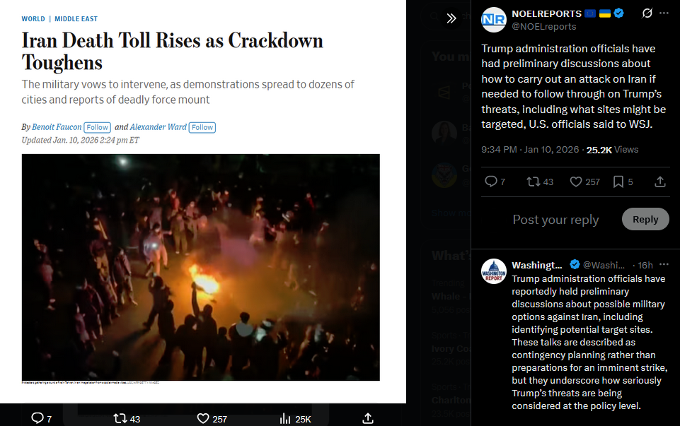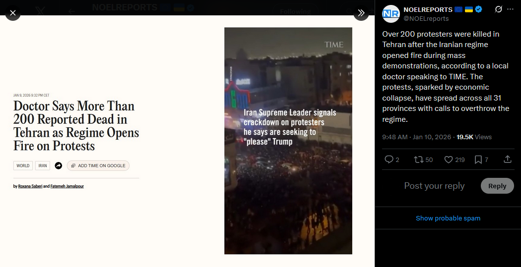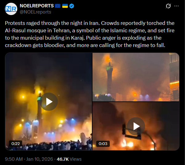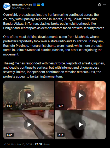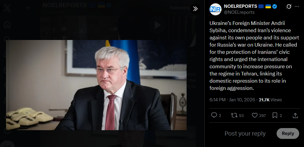 Ukraine’s Foreign Minister Andrii Sybiha, condemned Iran’s violence against its own people and its support for Russia’s war on Ukraine. He called for the protection of Iranians’ civic rights and urged the international community to increase pressure on the regime in Tehran, linking its domestic repression to its role in foreign aggression.https://x.com/NOELreports/status/2010052646690816067?s=20>21h