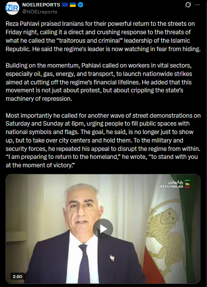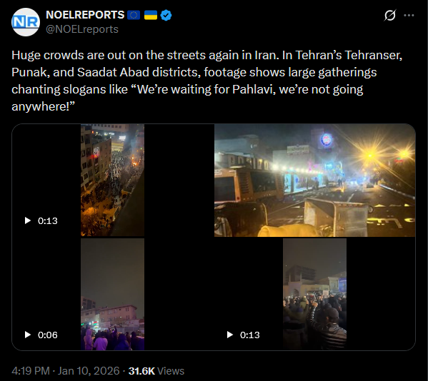 >>525732890Huge crowds are out on the streets again in Iran. In Tehran’s Tehranser, Punak, and Saadat Abad districts, footage shows large gatherings chanting slogans like “We’re waiting for Pahlavi, we’re not going anywhere!”https://x.com/NOELreports/status/2010023742420988119?s=20>23hvideo 1https://files.catbox.moe/snayy6.mp4video 2https://files.catbox.moe/3ofhm2.mp4video 3https://files.catbox.moe/7h3bor.mp4pic https://files.catbox.moe/g0zzsg.jpg