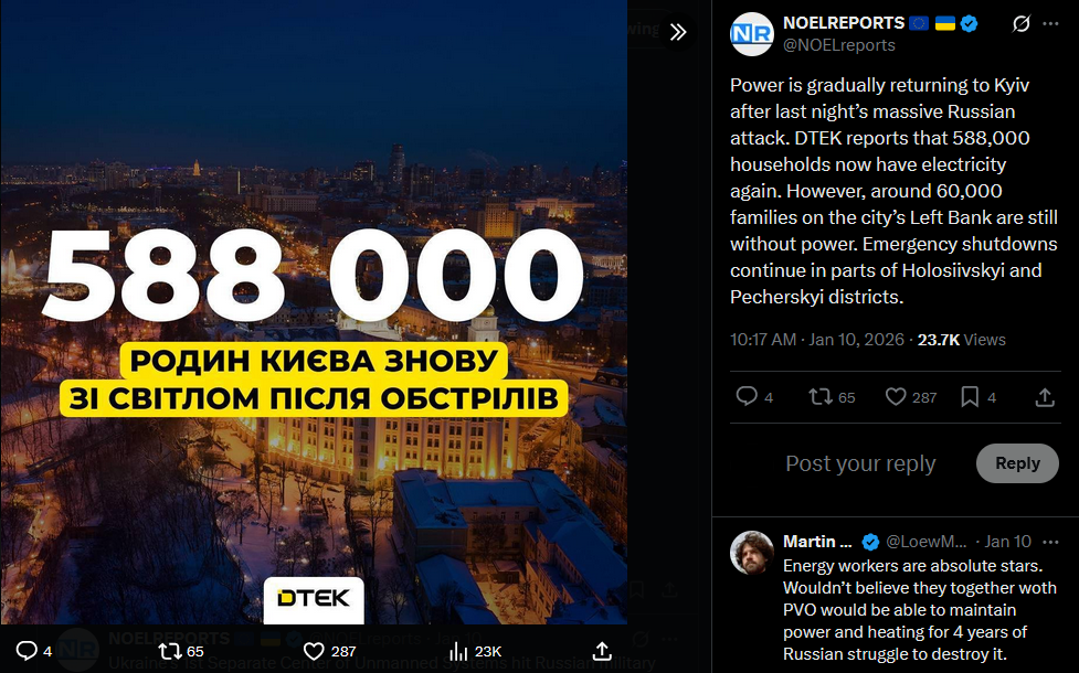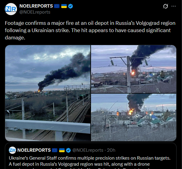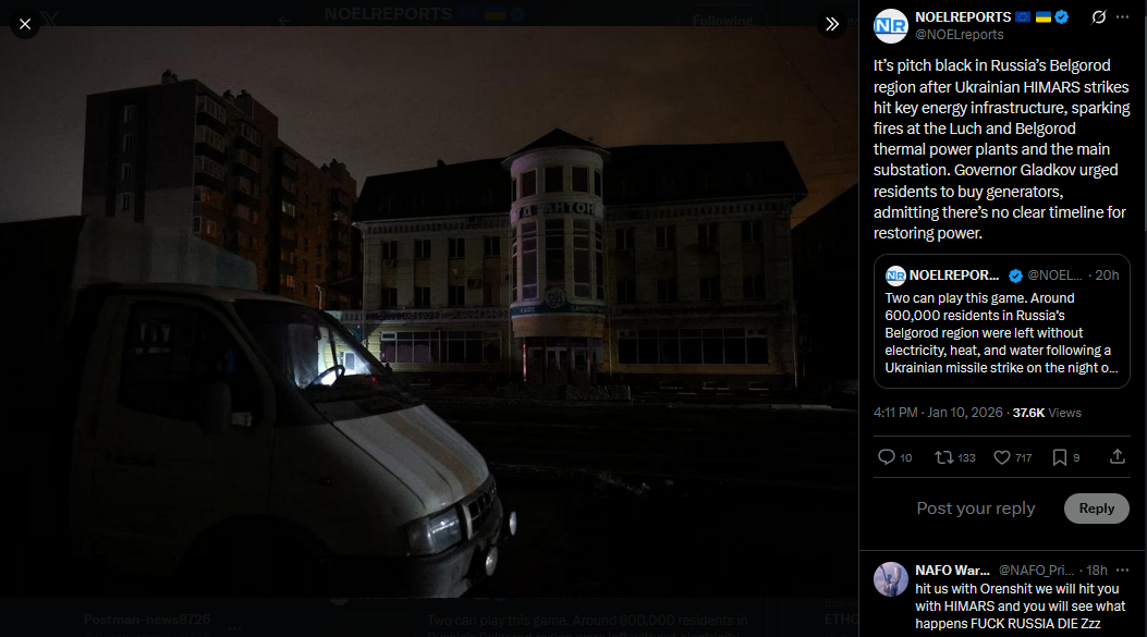 >>525732819It’s pitch black in Russia’s Belgorod region after Ukrainian HIMARS strikes hit key energy infrastructure, sparking fires at the Luch and Belgorod thermal power plants and the main substation. Governor Gladkov urged residents to buy generators, admitting there’s no clear timeline for restoring power.https://x.com/NOELreports/status/2010021699052351819?s=20>23h