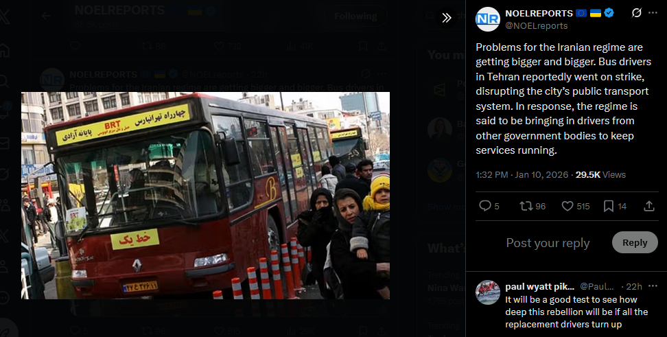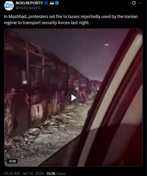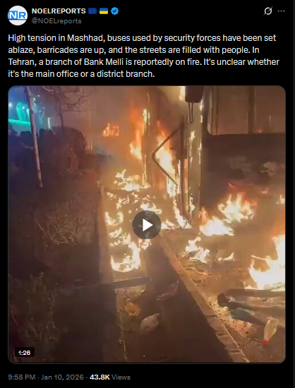 >>525735130High tension in Mashhad, buses used by security forces have been set ablaze, barricades are up, and the streets are filled with people. In Tehran, a branch of Bank Melli is reportedly on fire. It's unclear whether it's the main office or a district branch.https://x.com/NOELreports/status/2010109102656278781?s=20>18hhttps://files.catbox.moe/81gpay.mp4