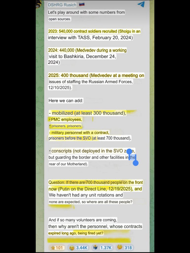 Previous: >>525709392Day 1,418 – Daily assessment: understandingwar.org/analysis/russia-ukraine/#research▶Latest>The 3 day SMO has now lasted longer than the entire soviet-German war>Ukrainian forces struck an oil depot in russia’s Volgograd region and hit multiple russian military targets in occupied Ukrainian territories, the General Staff said.>Ukraine shot down a russian Iskander missile over Kharkiv for the first time>Finland officially withdraws from the Ottawa treaty>ru milbloggers say internet blackouts in russia don't stop UA drones. Kamchatka, 7,500 km from Ukraine is offline since Dec 31>Fifth pidor tanker seized by the U.S.>Adam kadyrov, son of chechen leader ramzan kadyrov, said he would find and bring Zelenskyy to Grozny if ordered by putin or by his father>Smoooking accident at Orel heating plant>500k consumers without power in Bilhorod after strikes on critical infrastructure>pidor chimpout in response to the "attack" on monke's residence (didn't happen, should've happened), an oreshnik irbm was also used, 500k consumers without power in Kyiv>russian troops strap Starlink terminals to horses>Smoooking accident on the Palau-flagged oil tanker Elbus off the coast of Turkey>U.S. seizes russian tanker as they cuck out and do nothing but watch>Hegseth openly mocked russia’s air defense systems.>UK and France to send troops to Ukraine post-war>Czech-led ammunition initiative for Ukraine will continue - Babis>russia Cannot Maintain Its Ports in the Arctic - SZRU▶Telegramrentry.org/telosint2023t.me/ukr_pics▶Intelt.me/DeepStateENodin.tradoc.army.mil/WEG (equipment explorer)ukr.warspotting.net (visually confirmed losses)▶Mapsdeepstatemap.live/enliveuamap.com/en▶DISPOSABLE SOLDIER (diary of a RU mobik)TOURS 1-4: files.catbox.moe/mpcw7p.zip▶12 min of TZD in one ditch (Pokrovsk area) - 28 killedfiles.catbox.moe/sxbxfb.mp4