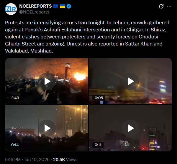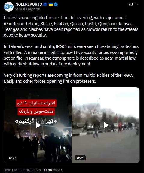>>525733216Protests are intensifying across Iran tonight. In Tehran, crowds gathered again at Ponak’s Ashrafi Esfahani intersection and in Chitgar. In Shiraz, violent clashes between protesters and security forces on Ghodosi Gharbi Street are ongoing. Unrest is also reported in Sattar Khan and Vakilabad, Mashhad.https://x.com/NOELreports/status/2010038001569804763?s=20>22hvideo 1https://files.catbox.moe/laahbn.mp4video 2https://files.catbox.moe/4bd3ix.mp4video 3https://files.catbox.moe/no9cp9.mp4video 4https://files.catbox.moe/w1ubyx.mp4