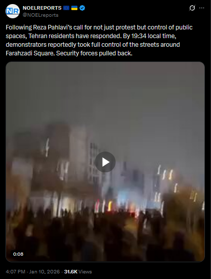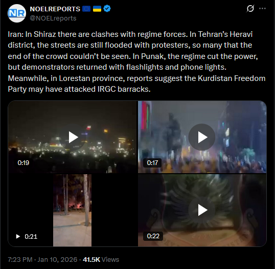 >>525734408Iran: In Shiraz there are clashes with regime forces. In Tehran’s Heravi district, the streets are still flooded with protesters, so many that the end of the crowd couldn’t be seen. In Punak, the regime cut the power, but demonstrators returned with flashlights and phone lights. Meanwhile, in Lorestan province, reports suggest the Kurdistan Freedom Party may have attacked IRGC barracks.https://x.com/NOELreports/status/2010069925898092584?s=20>20hvideo 1https://files.catbox.moe/dvy6i4.mp4video 2https://files.catbox.moe/lcjtna.mp4video 3https://files.catbox.moe/kmmg7f.mp4video 4https://files.catbox.moe/y3r40u.mp4