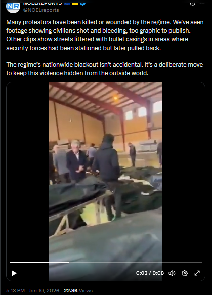 >>525733007 idk >>525733123Many protestors have been killed or wounded by the regime. We've seen footage showing civilians shot and bleeding, too graphic to publish. Other clips show streets littered with bullet casings in areas where security forces had been stationed but later pulled back.The regime’s nationwide blackout isn’t accidental. It’s a deliberate move to keep this violence hidden from the outside world.https://x.com/NOELreports/status/2010037222704328778?s=20>23hhttps://files.catbox.moe/59gwt5.mp4