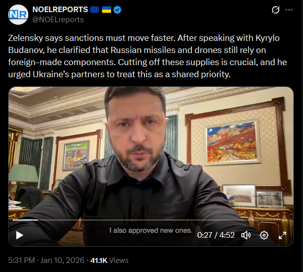 Zelensky says sanctions must move faster. After speaking with Kyrylo Budanov, he clarified that Russian missiles and drones still rely on foreign-made components. Cutting off these supplies is crucial, and he urged Ukraine’s partners to treat this as a shared priority.https://x.com/NOELreports/status/2010041810803142883?s=20>22hhttps://files.catbox.moe/261w8i.mp4