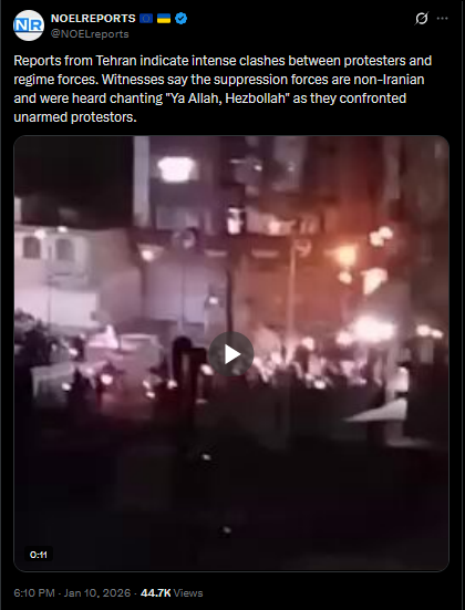 >>525733615 and horses 2026>>525733571Reports from Tehran indicate intense clashes between protesters and regime forces. Witnesses say the suppression forces are non-Iranian and were heard chanting "Ya Allah, Hezbollah" as they confronted unarmed protestors.https://x.com/NOELreports/status/2010051665509134677?s=20>21hhttps://files.catbox.moe/886yza.mp4