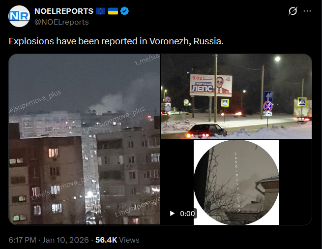Explosions have been reported in Voronezh, Russia.https://x.com/NOELreports/status/2010053322422853786?s=20>21hpic 1https://files.catbox.moe/upam03.jpgpic 2https://files.catbox.moe/qpolzp.jpgvideo https://files.catbox.moe/zjrojq.mp4