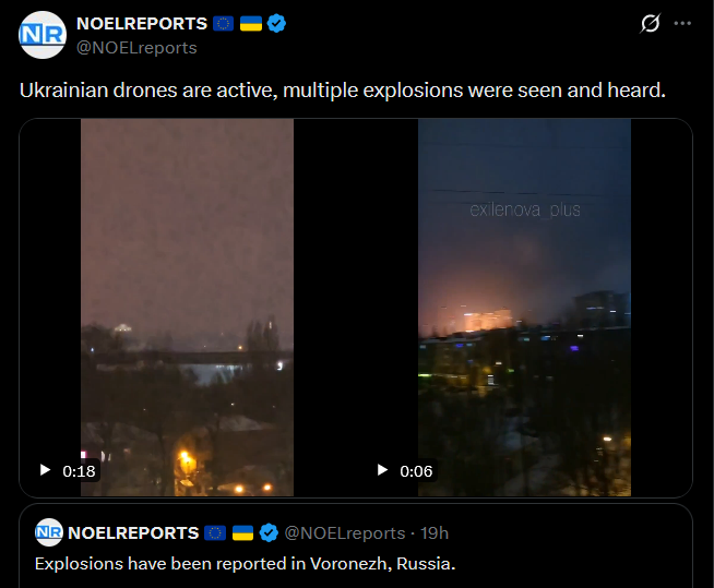 Explosions captured earlier tonight in Voronezh. Despite Russian claim that all 'targets were shot down', and 'air defense worked perfectly', several impacts could clearly be seen and heard.https://x.com/NOELreports/status/2010122580339151280?s=20>17hhttps://files.catbox.moe/sf1uxd.mp4