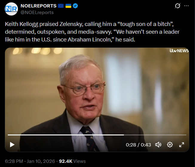 Keith Kellogg praised Zelensky, calling him a “tough son of a bitch”, determined, outspoken, and media-savvy. “We haven’t seen a leader like him in the U.S. since Abraham Lincoln,” he said.https://x.com/NOELreports/status/2010056144895820244?s=20>21hhttps://files.catbox.moe/lqixkz.mp4